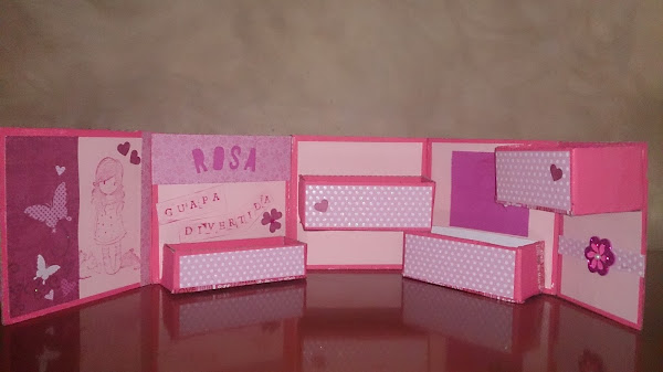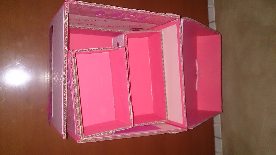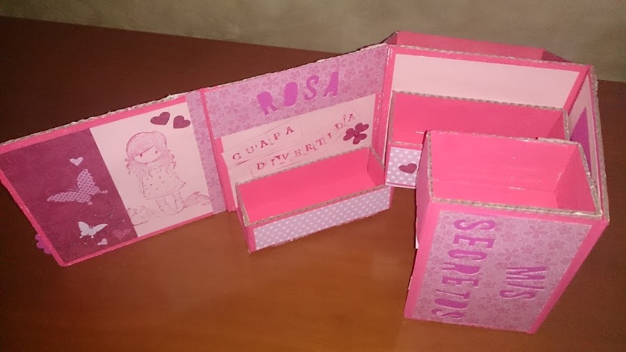 Esta vez os quiero mostrar una caja de cartón hecha totalmente a mano que al abrirse se transforma en un pequeño mueble para mi niña Rosa para que guarde sus tesoros, sus cartas, sus joyitas, etc.