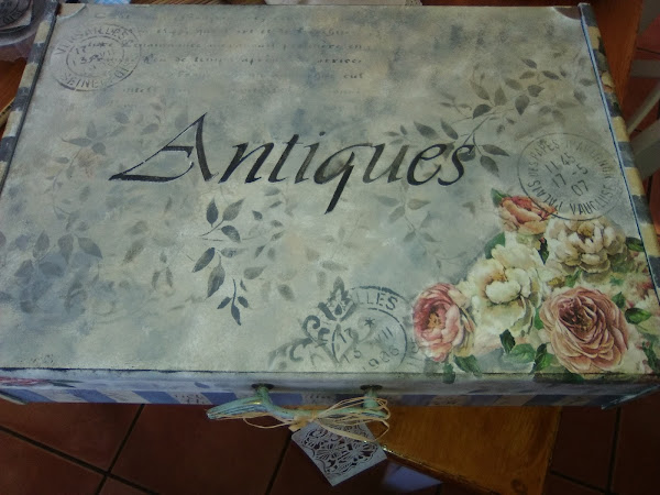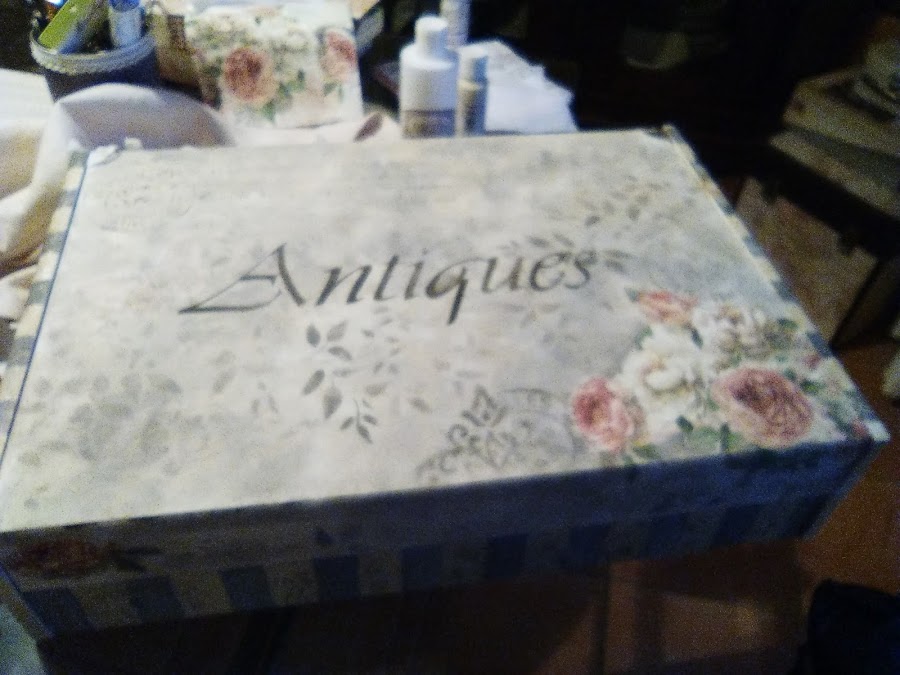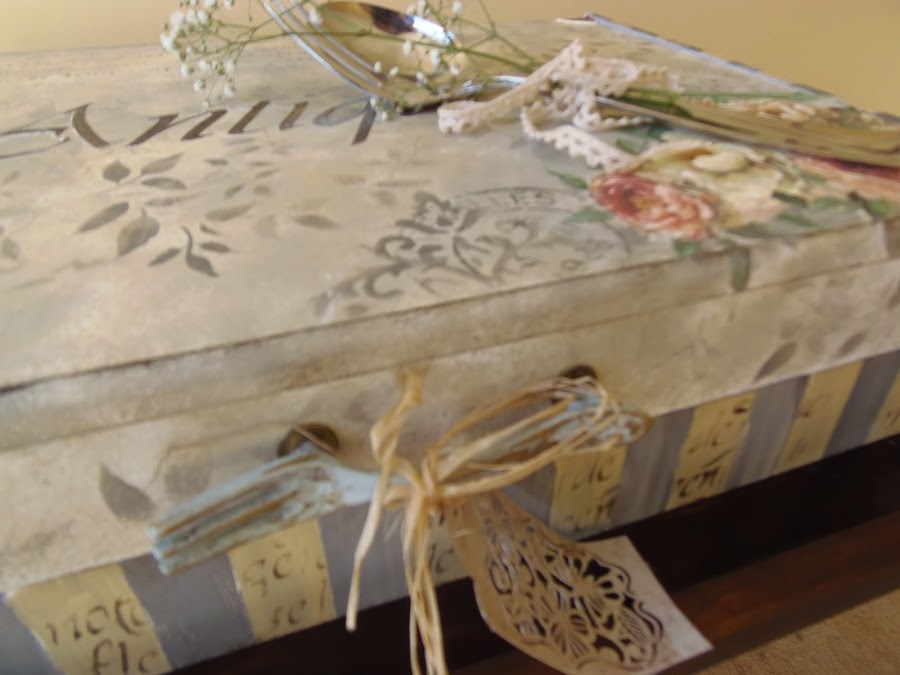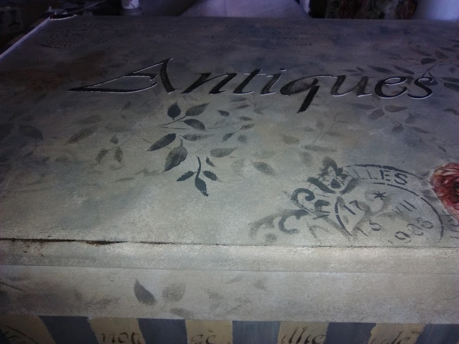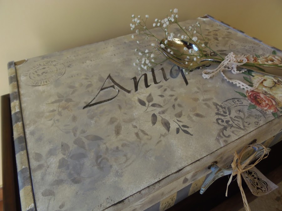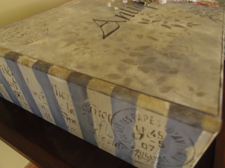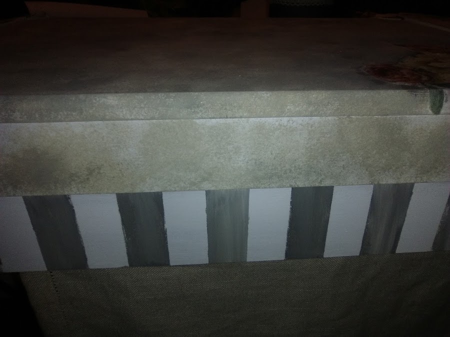 Hice un esponjado en la tapa con varios tonos,blanco,beige,gris,azul,lino y unas rayas a la parte inferior