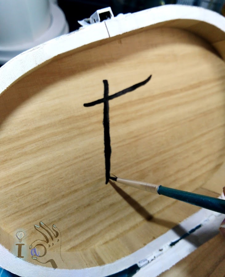 Al principio todo parecía ir muy bien, pinté directamente sobre la madera porque si la hubiera barnizado la tinta no hubiese cogido sobre el barniz. Pero al poco resultó que en los trazos verticales la tinta, en algunas partes, se extendía entre las vetas de la madera, . Pero ya no había nada que hacer.... En fin, tengo una herramienta que aún no he estrenado que es para grabar (tipo dremell) y cuando la domine intentaré grabar alrededor del símbolo a ver si la tinta no ha penetrado mucho y consigo quitar esos "borrones" que han salido....