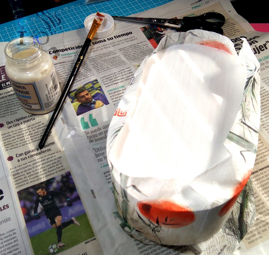 A continuación ví cómo poner la servilleta para que me llegase para cubrir toda la caja, bueno, casi toda. Hubiese llegado para cubrirla entera, pero decidí que quedaría mejor dejando la parte inferior blanca porque tampoco hubiera casado bien del todo. De los 4 cuadraditos que suele tener una servilleta usé uno para la tapa y 3 para los laterales.