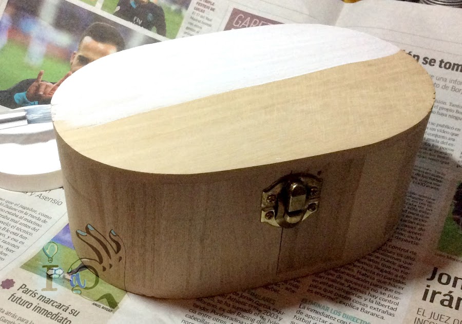 Lo primero que hice fue dar a toda la caja una capa de pintura a la tiza blanca. Ya os he dicho alguna vez que me encanta esta pintura porque no necesita imprimación ni nada y además deja un acabado muy bueno.