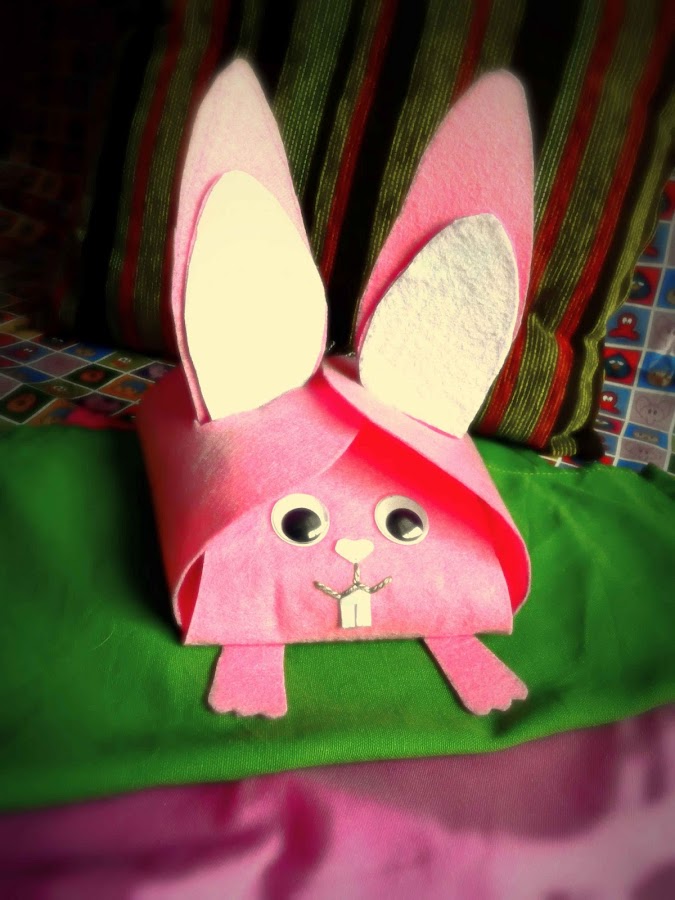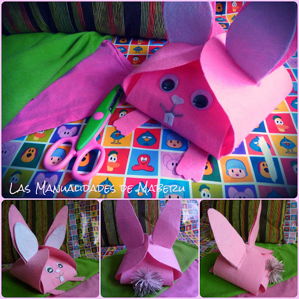 Esta manualidad está hecha principalmente con fieltro rosa, excepto las largas orejas, el hocico y los dientecitos de roedor, donde he añadido fielto blanco. Para la cola se me ocurrió hacer un pompón de lana, y los ojos, como en el caso de nuestra amiga la iguana Óscar, son móviles.