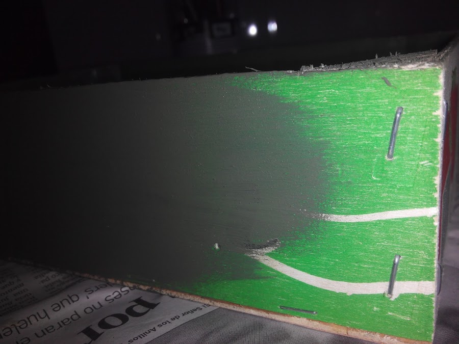 Ahora tocaba pasar una lija para sacar vetas donde se vean el color verde de la primera capa, tampoco dando muy fuerte para no quedarnos sin pintura y que aparezca la madera.