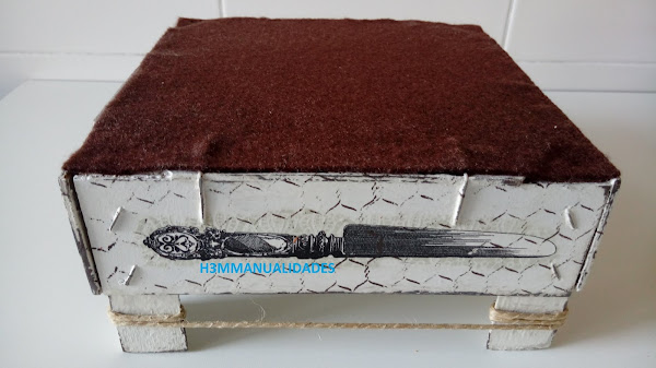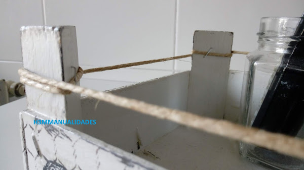 También tenía claro desde el principio que le iba a hacer una especie de "barandilla" de cuerda, que fui colocando con unas grapas en la parte interior de las maderas verticales. para que no estropeara la mesa, le puse una base de fieltro marrón que apliqué con silicona caliente. Y este es el resultado final.