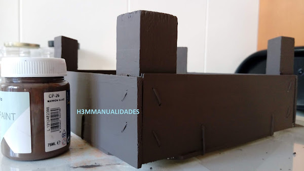 Como la iba a pintar primero con un color marrón chocolate, y la caja era negra, no di imprimación: pasé a pintar directamente con pintura a la tiza. Bueno, he obviado la limpieza previa... agua y jabón e incluso un cepillado con algo de lejía rebajada...