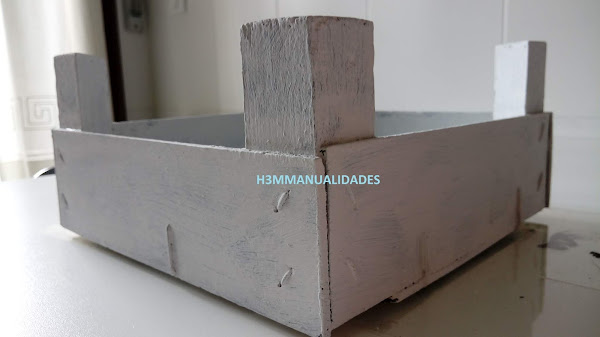 Mi intención era decapar la pintura, haciendo que el fondo fuera oscuro. Por eso, tras pintar con marrón, pasé la cera de una vela por bordes y esquinas. Así, al pintar con la siguiente pintura (color "blanco antiguo") y luego lijar, ésta saltaría donde está la cera y se vería el color marrón. Del color blanco creo recordar que di un par de manos, pero al lijar salió fácilmente el tono oscuro de la base.