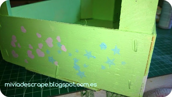 Los laterales están decorados con los colores Pink Carnation y Surf usando otro stencil de Heidi Swapp (Confetti Stencil).