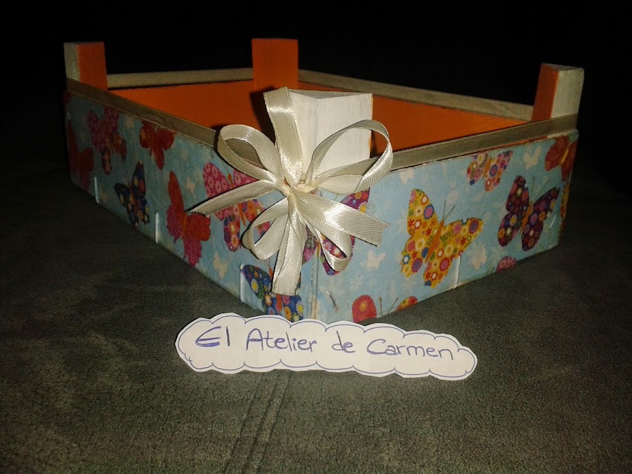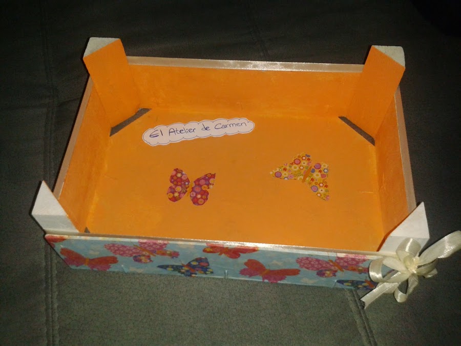 El interior esta pintado en naranja, aunque previamente la caja entera lleva una imprimación en blanco para eliminar los colores y letras de la caja original. También he decorado el fondo de la caja con unas mariposas del mismo motivo de la servilleta.