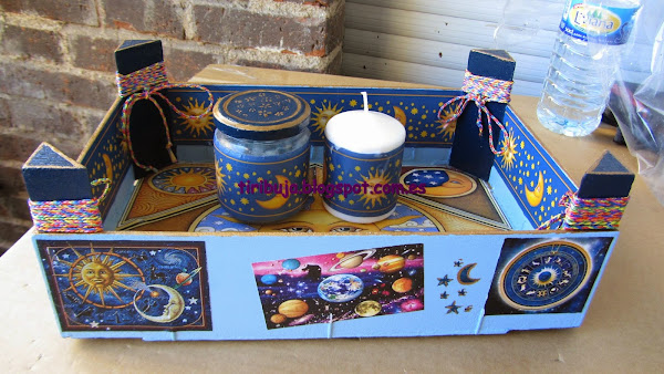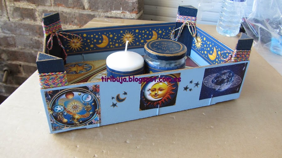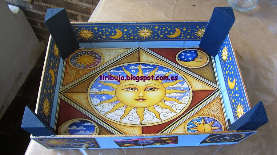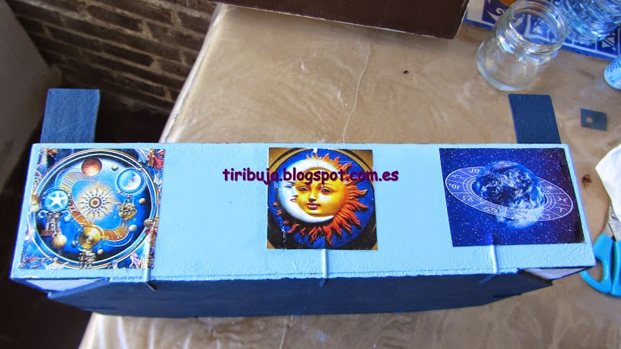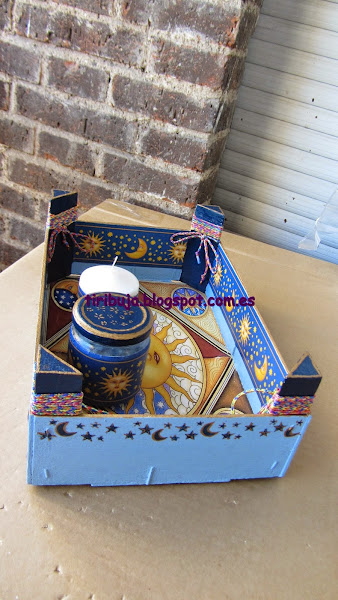 Una vez pintada la caja tenemos que ir pegando las imágenes... De fondo le puse una lámina con soles y lunas de los mismos tonos que la caja... en los laterales inferiores le puse una cenefa hecha por mi con el photoshop... la verdad es que busque una cenefa que tuviera estrellas y lunas, con los mismos colores que la caja y no la encontré, así que no me toco otra que investigar y hacerla yo, al final quedó genial...