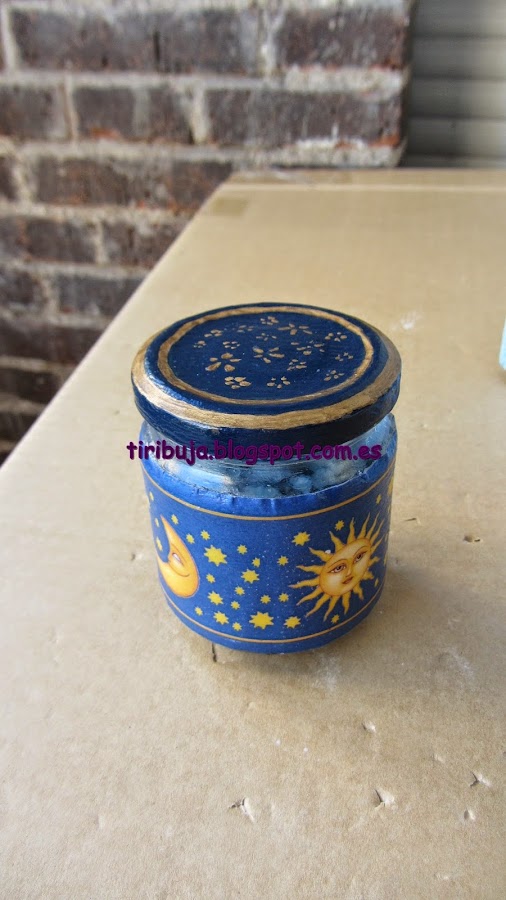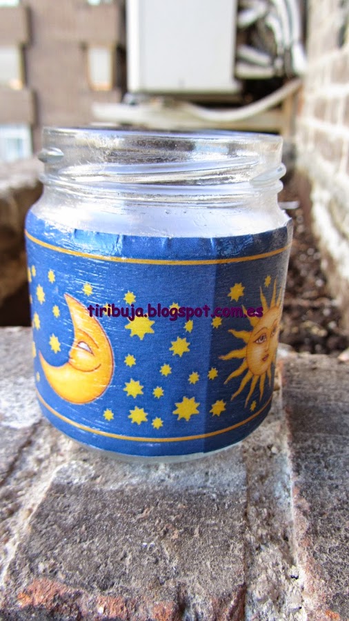 Un tarrito de cristal al que le hemos quitado la etiqueta y limpiado muy bien... Pegar con alkil la cenefa alrededor del tarro... dejarla secar un poco y darle alkil sobre la cenefa para protegerla... Luego una capa de barniz al agua a todo el bote...