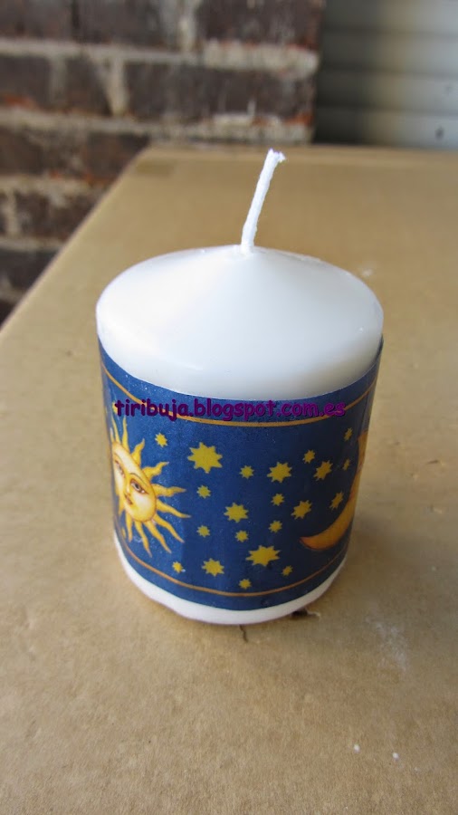 Para la vela solo necesite una vela blanca y un trozo de la cenefa que puse en el interior de la caja... Para que se quedara pegada solo tuve que planchar la vela y al desacerse la cera se incrusta la cenefa...