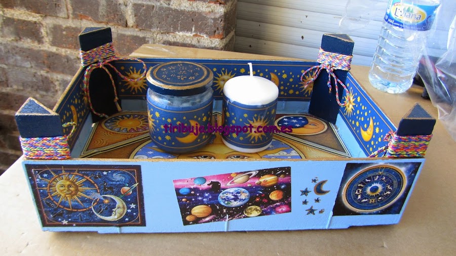 En los laterales exteriores le puse imágenes con planetas, astros, el zoodiaco, lunas, soles, etc....