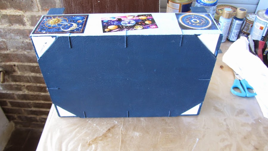 Una mano de imprimación blanca para que agarre la pintura.... dos capas de pintura azul... Con pintura de color oro pintar las estrellas y los bordes de la tapadera...