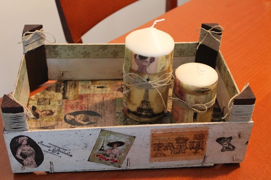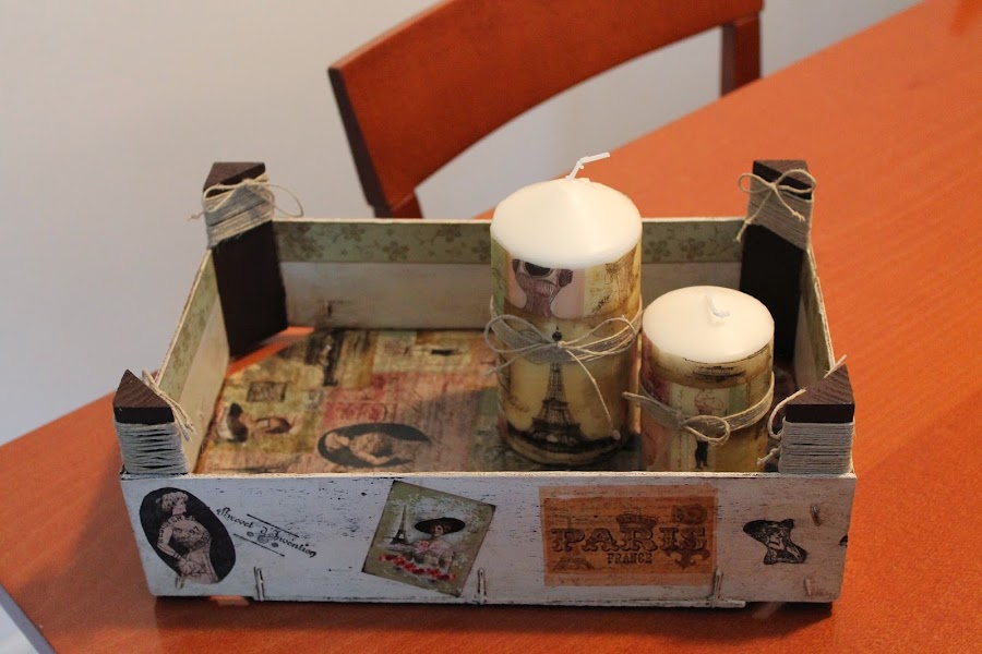 Aquí os presento otra caja de fresas a la que le damos esa segunda vida, decorada a juego con unos velones.
