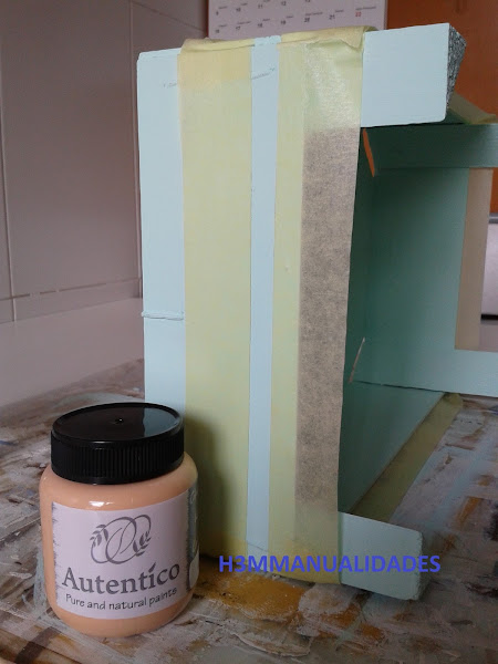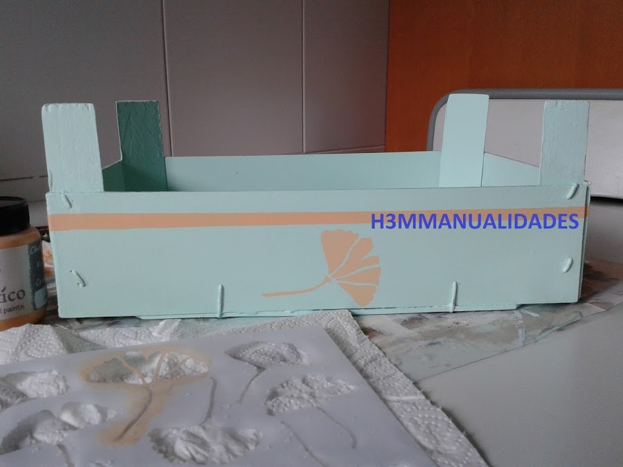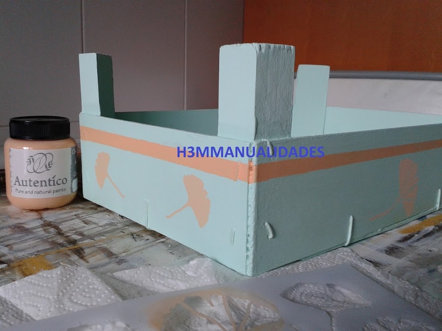 Y para la decoración, un tono melocotón. Para hacer la raya me ayudé de cinta de carrocero o pintor, como se ve en la imagen de arriba. Y luego, la plantilla de las hojas de ginkgo.