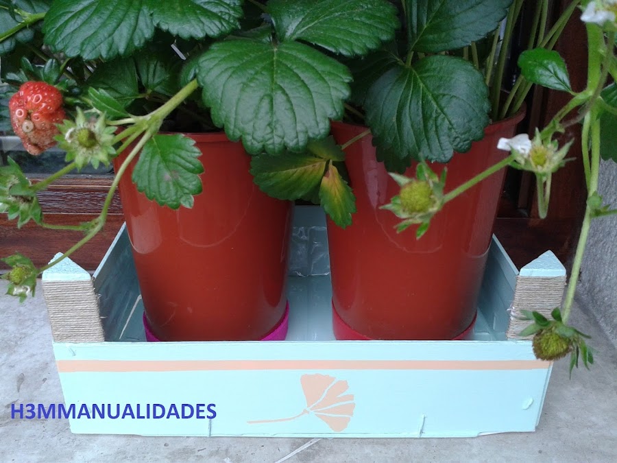 Como toque final di unas vueltas con cuerda fina por las "patas" de la caja y barniz mate para proteger. Y este es resultado de la caja de fresas... portando dos plantas de... fresas ;). Este es el aspecto que tenían hace meses, ahora, las pobres, no han podido resistir los calores (hoy, 40ºC !!!) y están bastante mal... :(