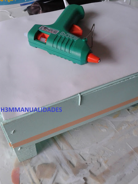 Con la pistola de silicona coloqué en la base un rectángulo de goma eva blanca, para evitar rozaduras con la superficie donde se colocara.