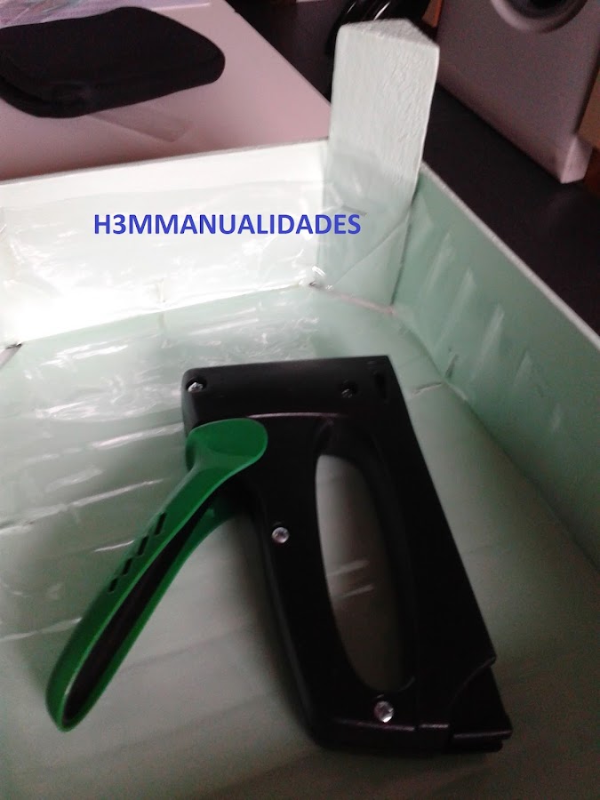 Y por el interior, y esta vez con ayuda de la grapadora, puse plástico, ya que su destino sería como macetero en el balcón, y así, al regar, no pasaría la humedad.