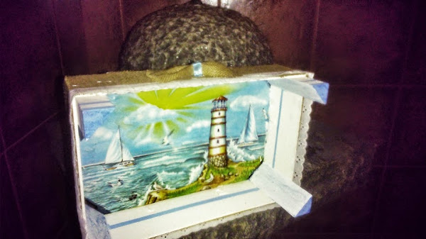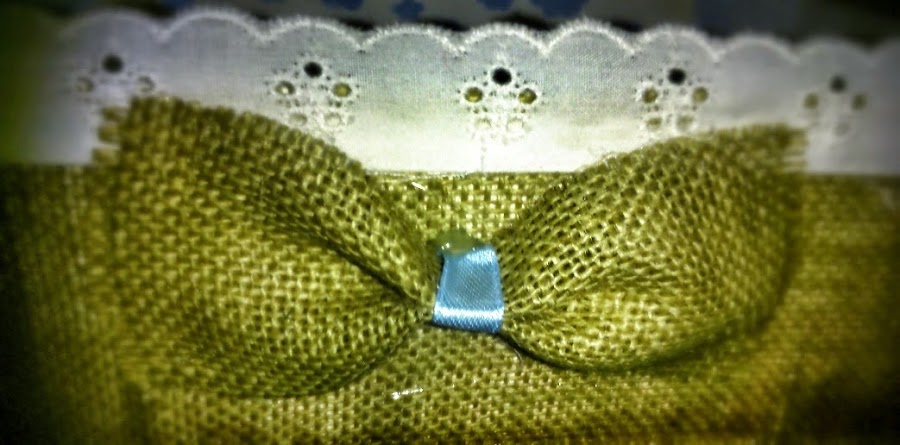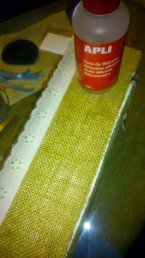 Los laterales los forre con tela arpillera y con cola blanca de carpintero (un poco aguada).Una vez terminado los laterales, con silicona liquida, le pegue una puntillita .para rematarlo quería ponerle unas conchas que mi hija tiene ,pero se negó a pegarlas así que decidí hacer lazos de arpillera y pegarlos en el frontal