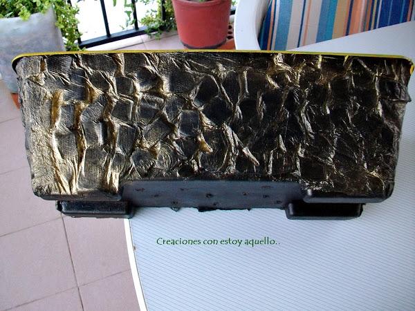 Así lo hice con el macetero grande y luego siguiendo su explicación puse papel de cocina y pincelé con cola.