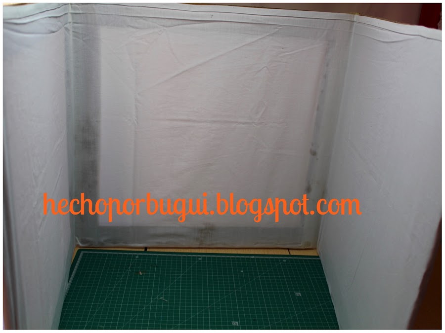 7.- En el resto de los lados pongo silicona, y voy estirando de la sábana para que quede lo más tensa posible, ya que si quedase floja haría sombras sobre el objeto a fotografiar.