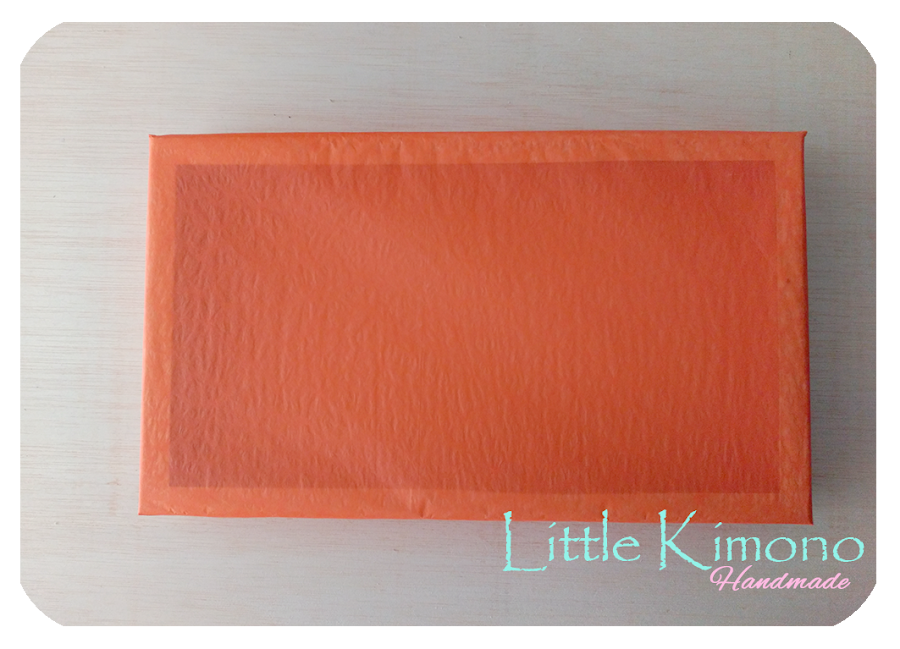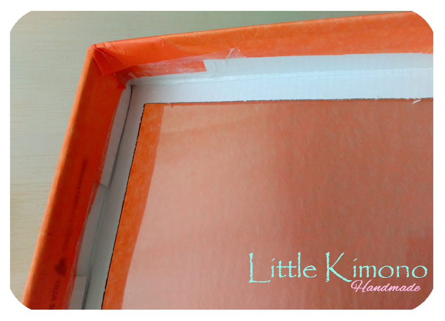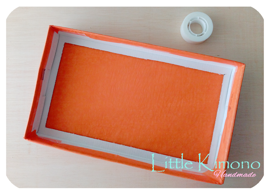 Forramos la tapa con el papel seda naranja y pegamos con la cinta adhesiva.