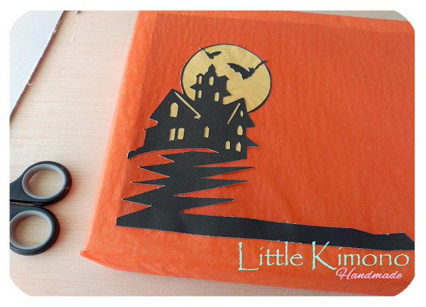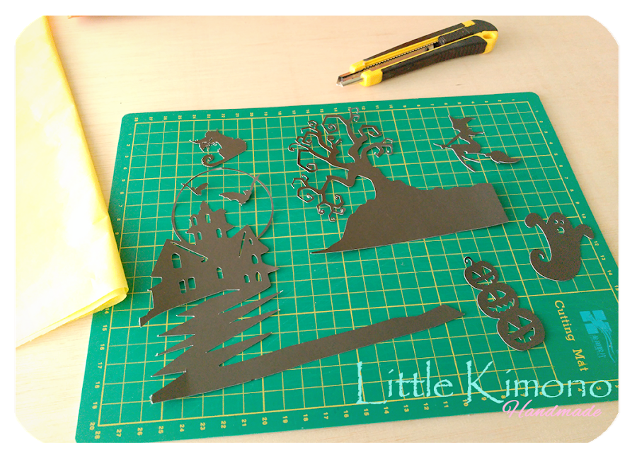 3. Cortamos las siluetas que deseamos pegar en nuestra caja de luz, si queremos dar algún toque especial a nuestras siluetas, éste es el momento de hacerlo con otro color de papel seda, como es el caso de las ventanas de mi casa encantada ^^