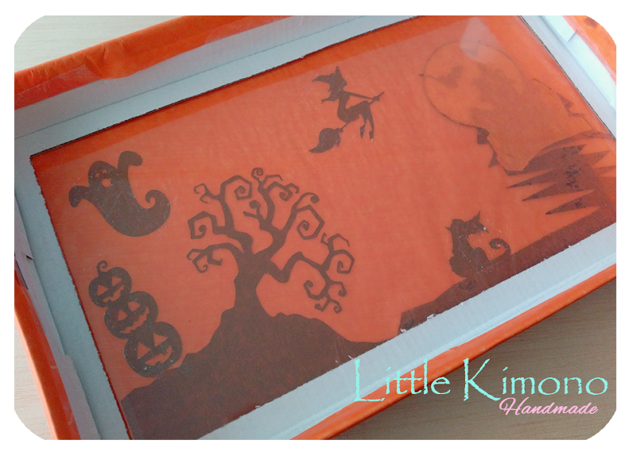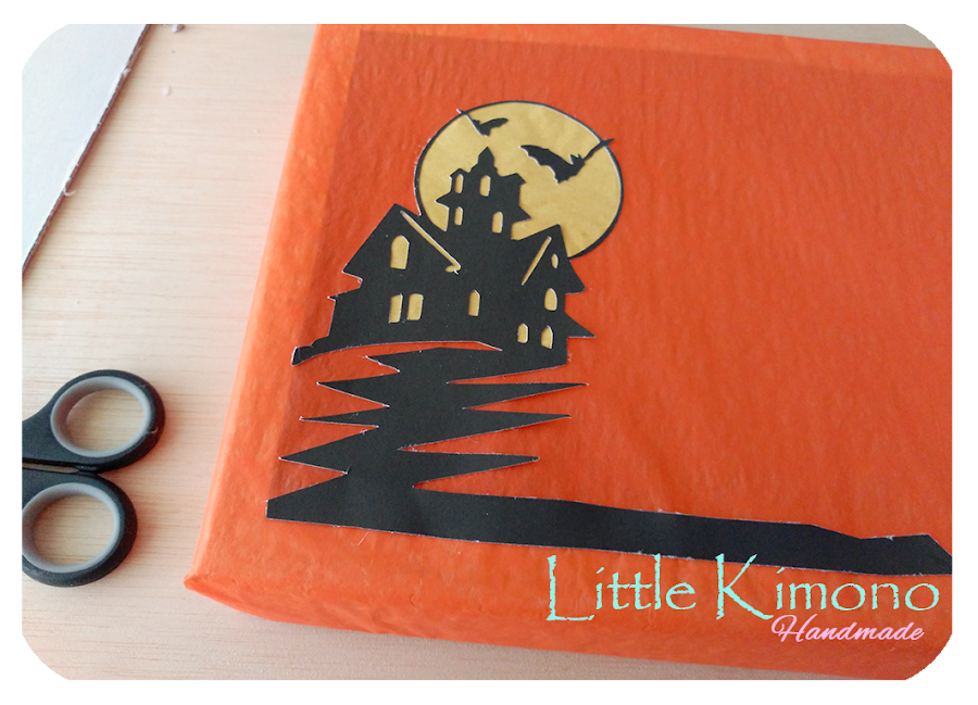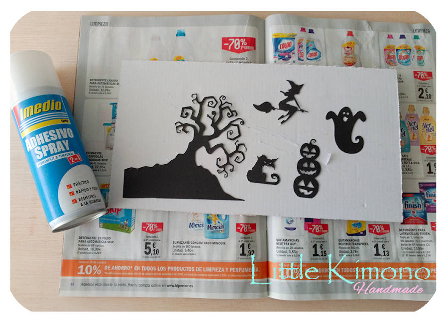 4. Ponemos pegamento en las siluetas, yo he usado pegamento en spray pero podéis usar cualquier pegamento para papel y las colocamos con cuidado en la tapa sobre el papel seda naranja, damos la vuelta a la tapa y podemos presionar para que se peguen bien.