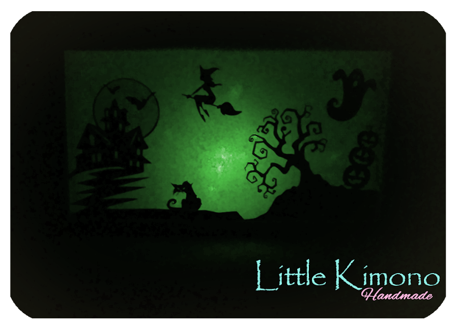 Apagamos las luces! y ya tenemos nuestra caja de luz lista para disfrutar de una noche terrorífica de Halloween. ◠‿◠ Mi vela de led va cambiando de colores, así que éste es el resultado final...