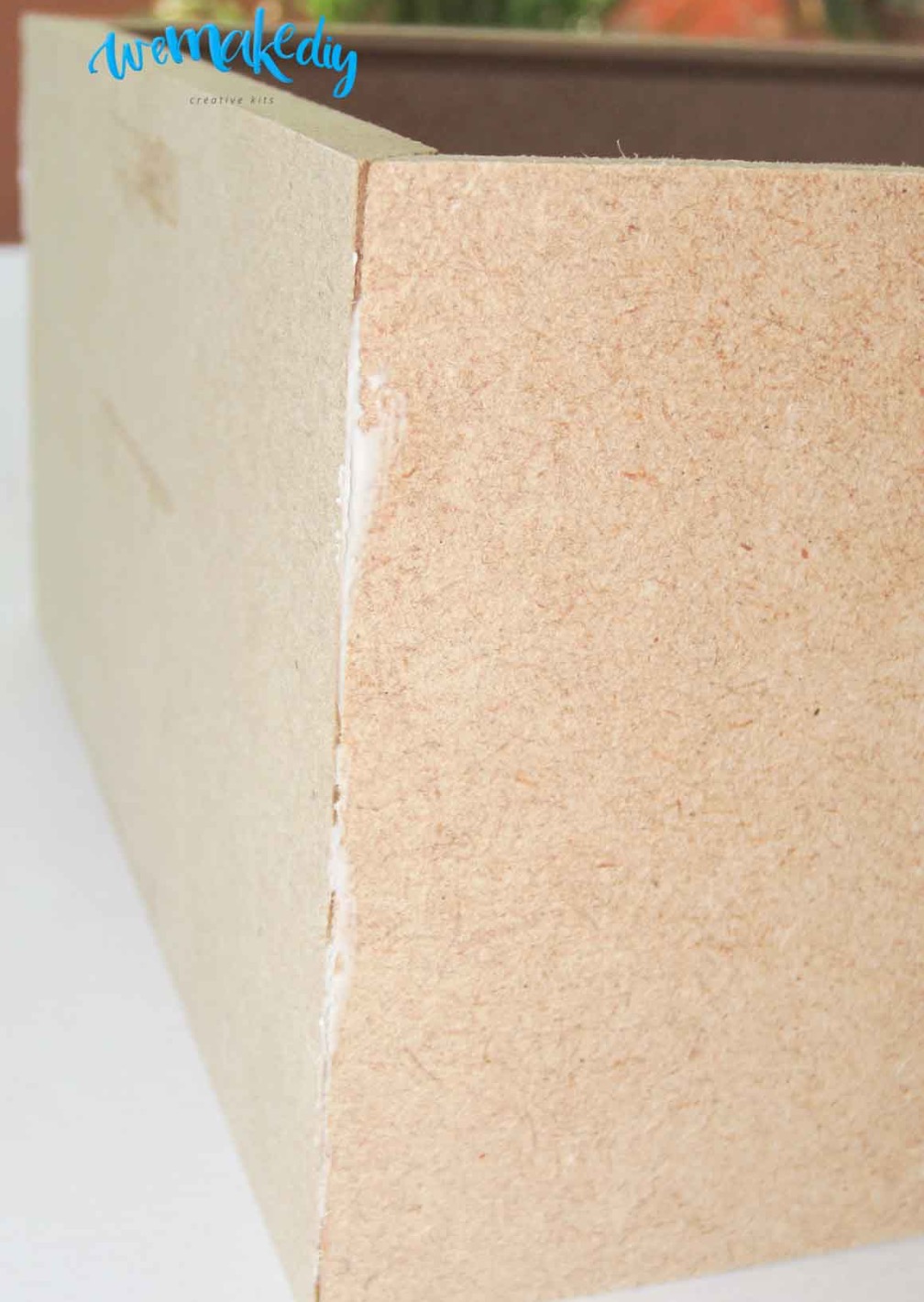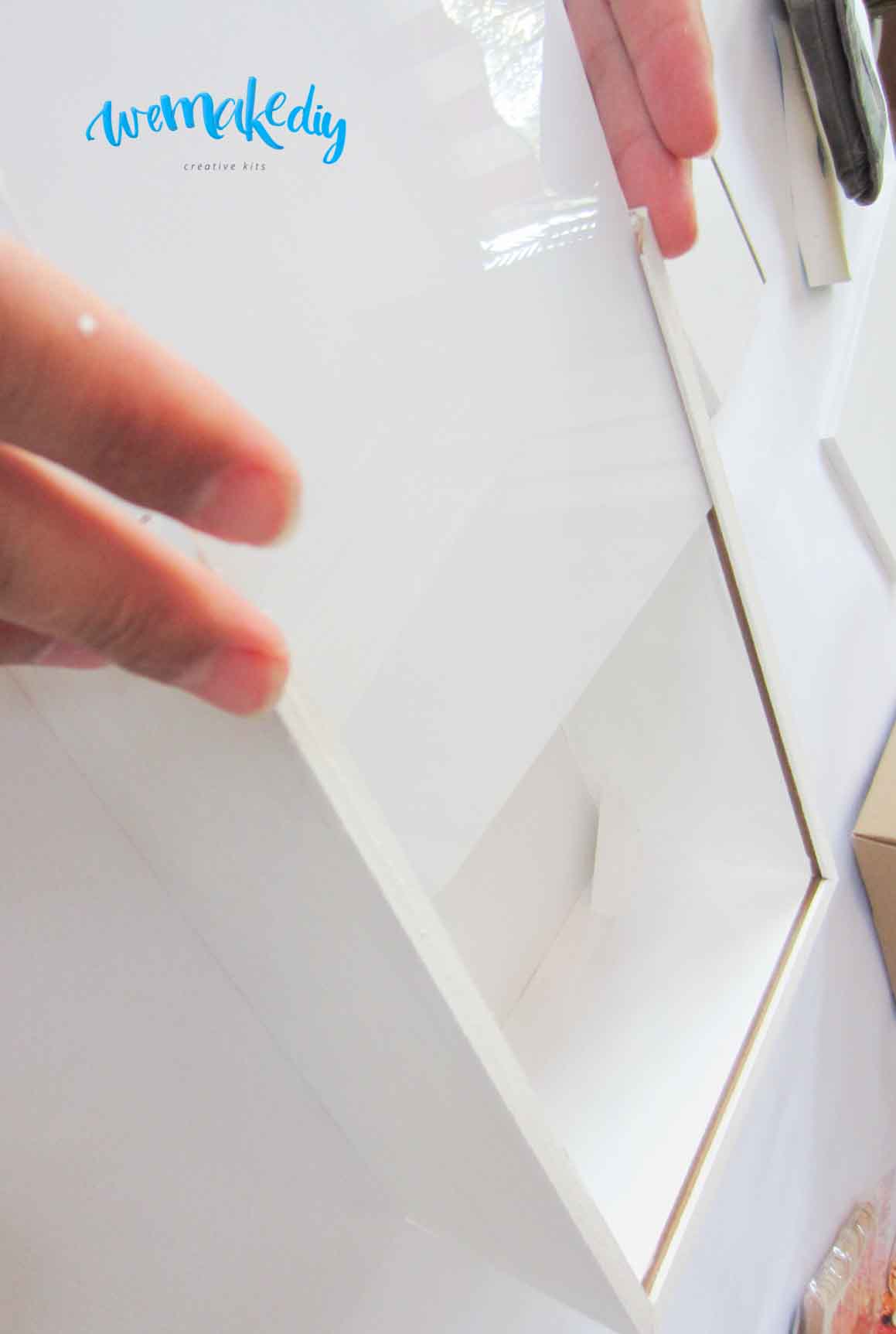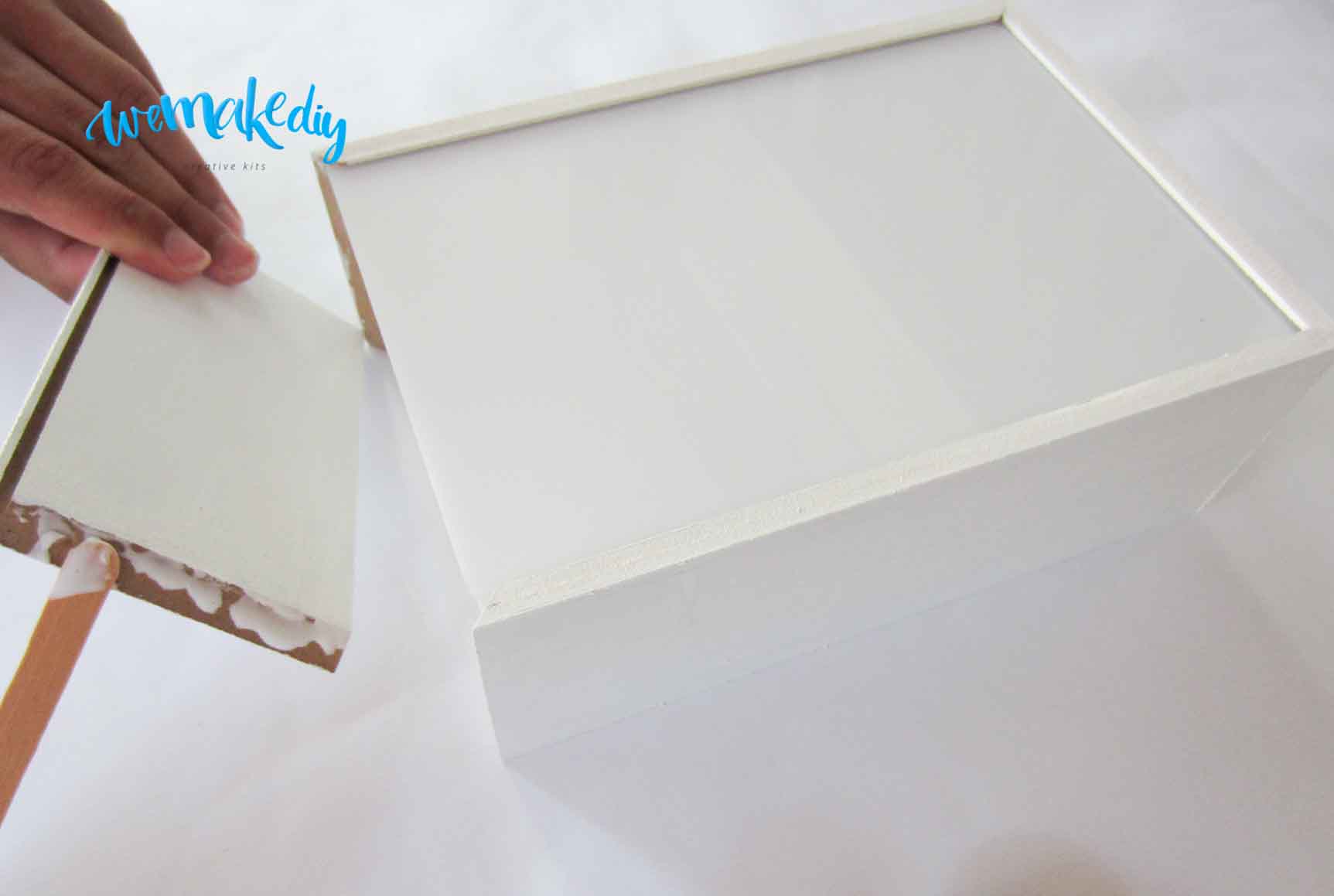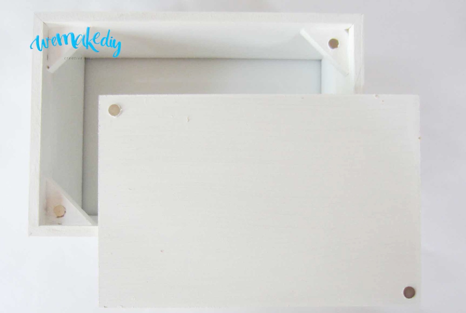 Primero: coge una esquinera sin imán y otra con imán, encola sólo sus dos lados cortos y pégalas en las esquinas de la estructura de madera que ya tienes montada, apoyándolas sobre la tapa. La que tiene imán debes pegarla con el imán boca abajo, es decir, contra la tapa. La que no tiene imán la pegaremos en la otra esquina. Recuerda que la tapa no debe pegarse, así que asegúrate que en el proceso no le caiga cola de los sobrantes y quede completamente libre.