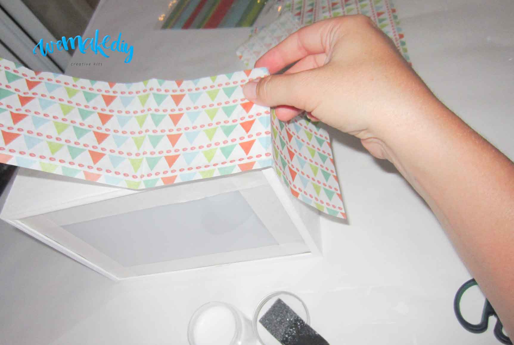 Lo primero que tienes que hacer es tomar la medida del papel que vas a necesitar para cubrir la superficie, dejando un poco de sobrante alrededor que servirá para cubrir los bordes frontales. Como referencia, puedes cortar el papel elegido en tiras de 8,5cm de ancho, que te dará para forrar el lado de la caja y el perfil frontal. Recorta todos los papeles que has medido y déjalos a mano.