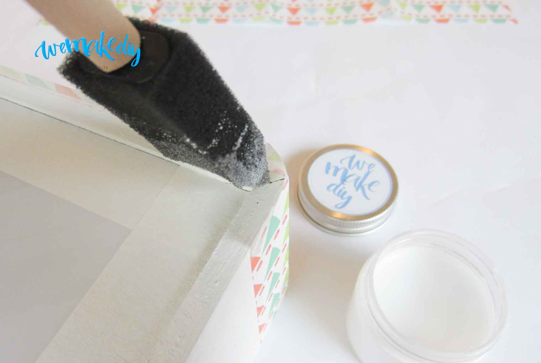 Cuando tengas toda la caja cubierta y ya esté seca, aplica una capa de cola sobre el papel que servirá para proteger la superficie.