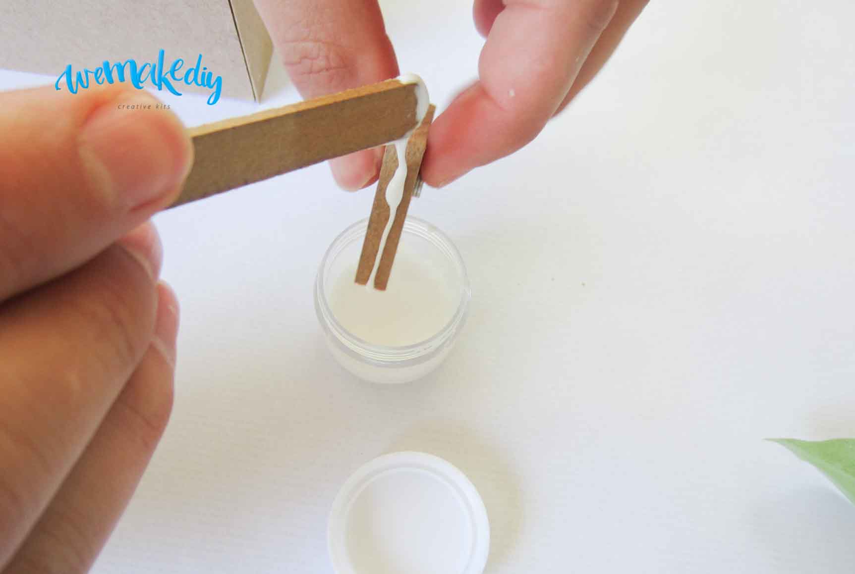 Preparar la cola de Decoupage: en el envase de cola que te incluimos en el kit y que has estado usando para montar la caja, añade la misma cantidad de agua que de cola (proporción 1-1), ciérralo bien y agítalo hasta que esté perfectamente mezclado.