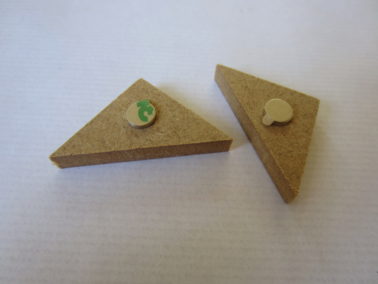 De las 4 esquineras que tienes (recuerda, los triángulos de madera), coge las 2 esquineras grandes y pega en cada una, uno de los pares de imanes del kit. Son autoadhesivos así que sólo tienes que quitar el precinto de uno de los lados y pegarlo. Una vez hecho tendrás dos esquineras con un par de imanes en cada una y otras dos esquineras (pequeñas) sin imanes.