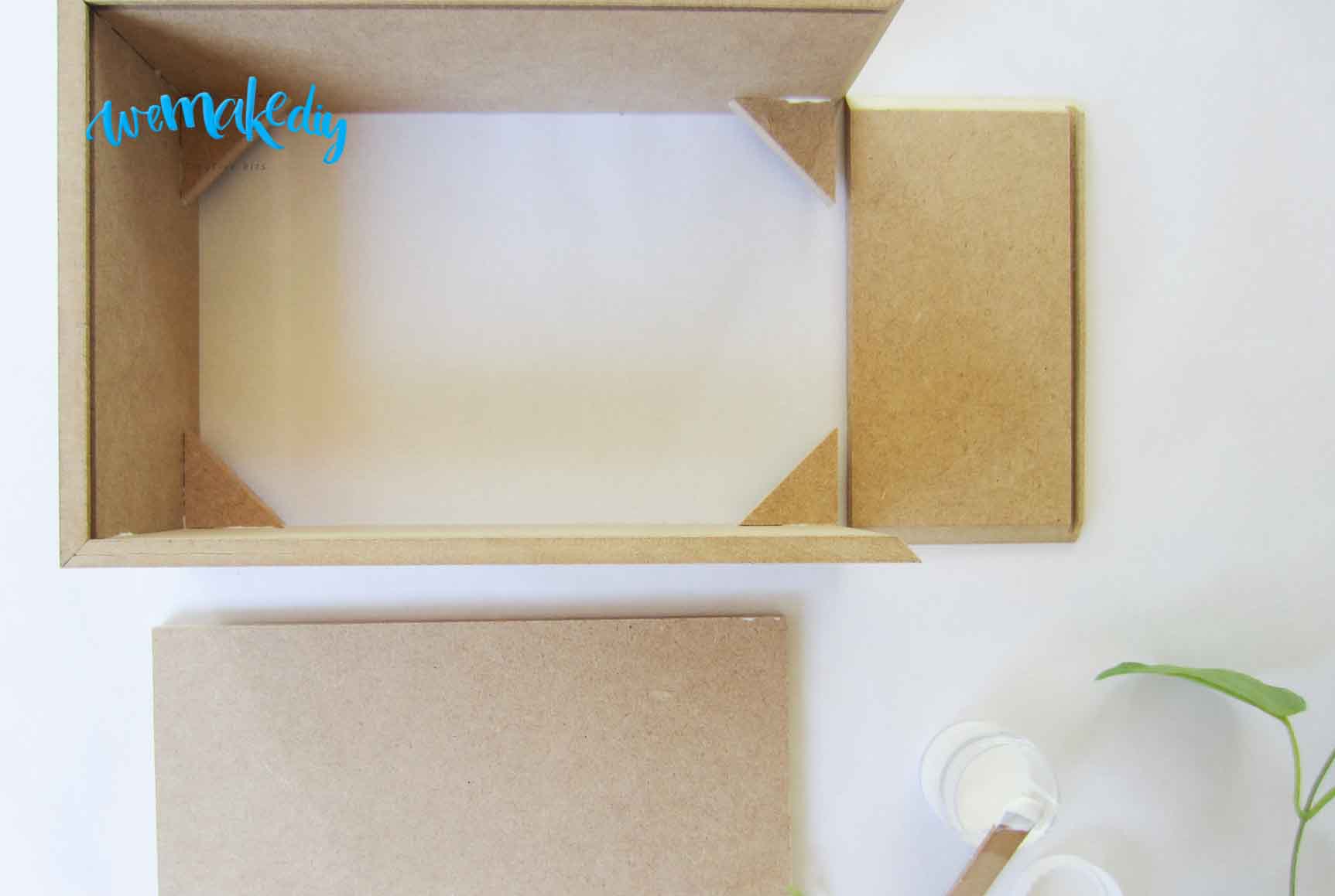 Una vez pegadas las cuatro esquineras tendremos la estructura casi montada. Fíjate que la tapa y la tabla pequeña no están pegadas y se pueden quitar:
