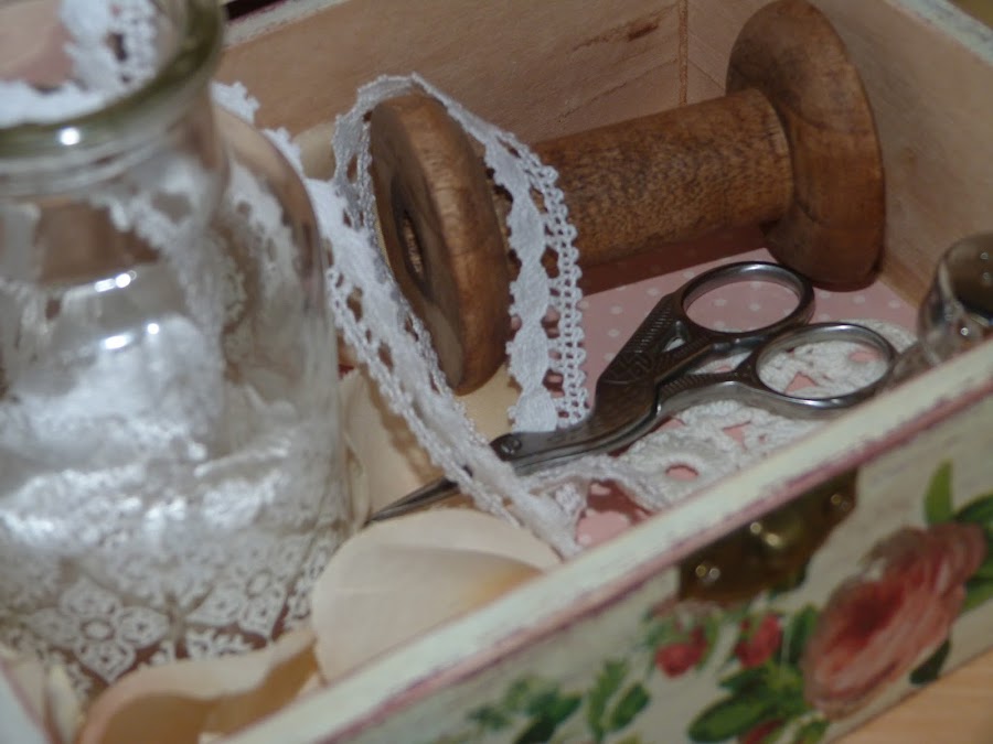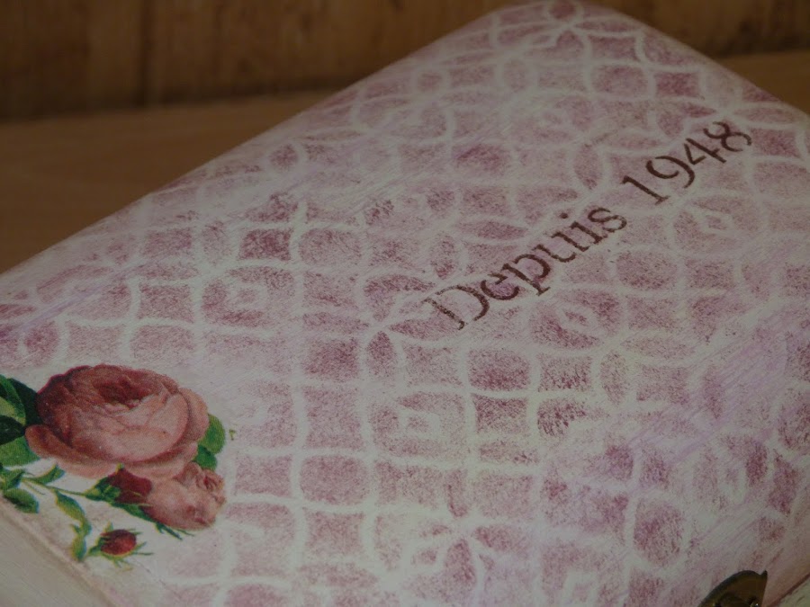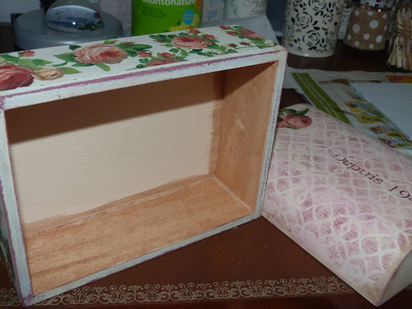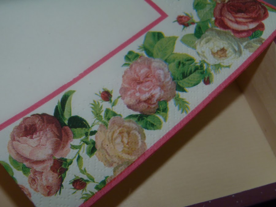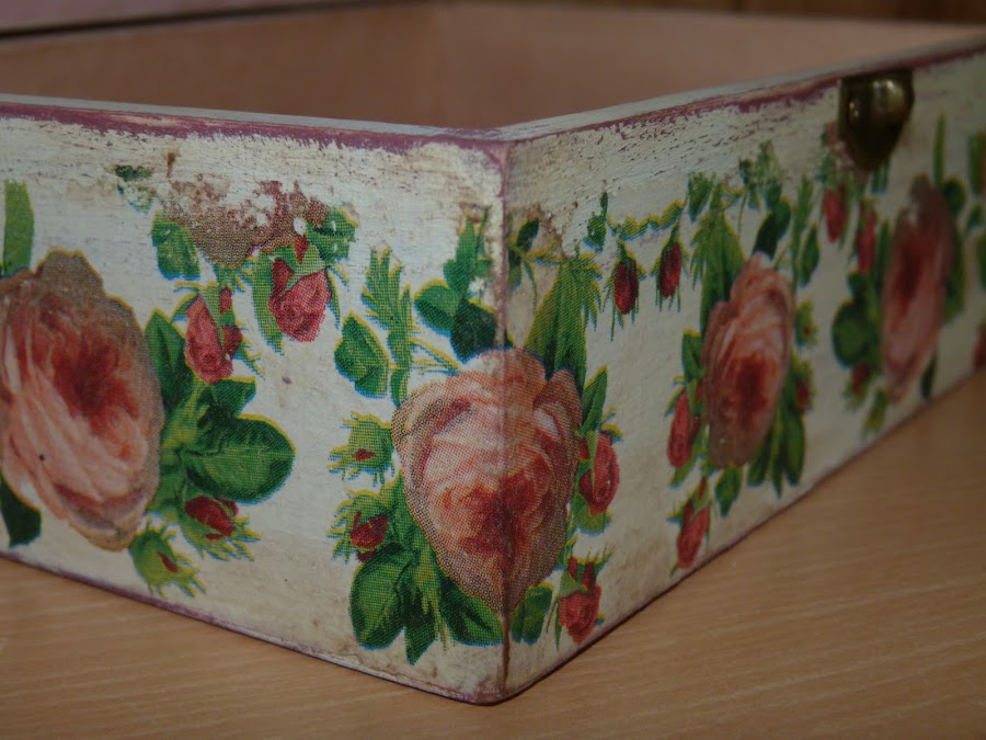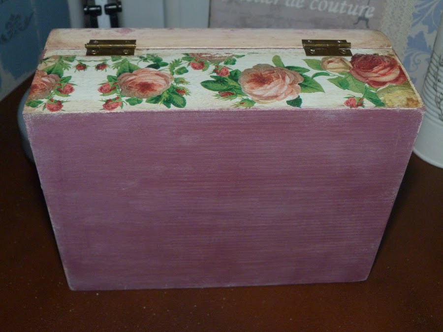 La parte que utilicé fue la cenefa de rosas, que puse en todo el contorno de la caja. Para integrarla aún mejor, con una lija fina fui repasando todos los bordes. Yo reconozco que a veces me paso, porque para resaltar el aspecto envejecido, en algunas zonas insisto mucho con la lija para desgarrar el papel... todo es cuestión de gustos.