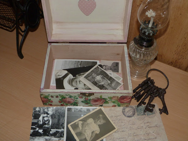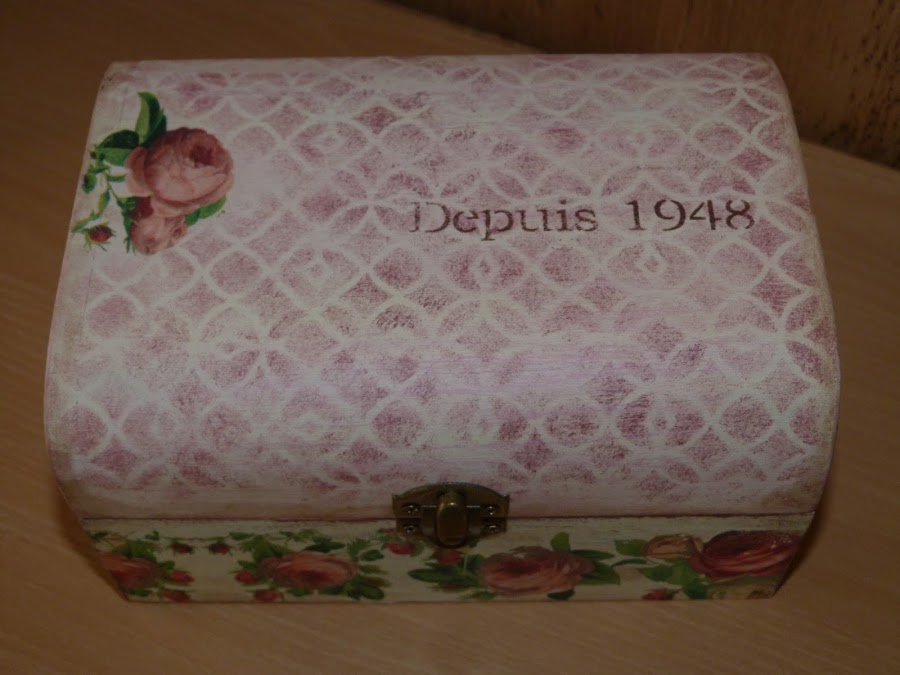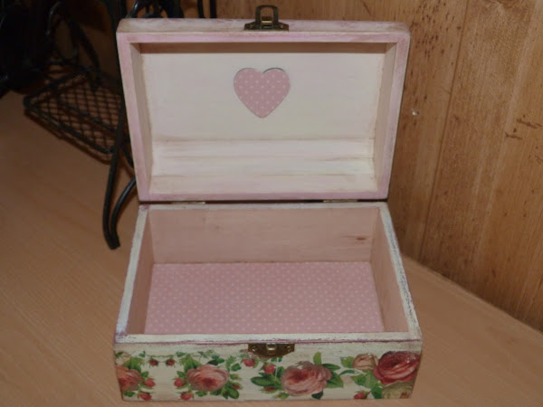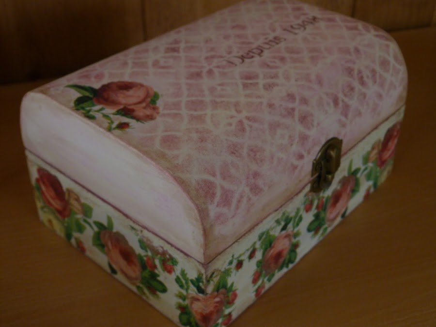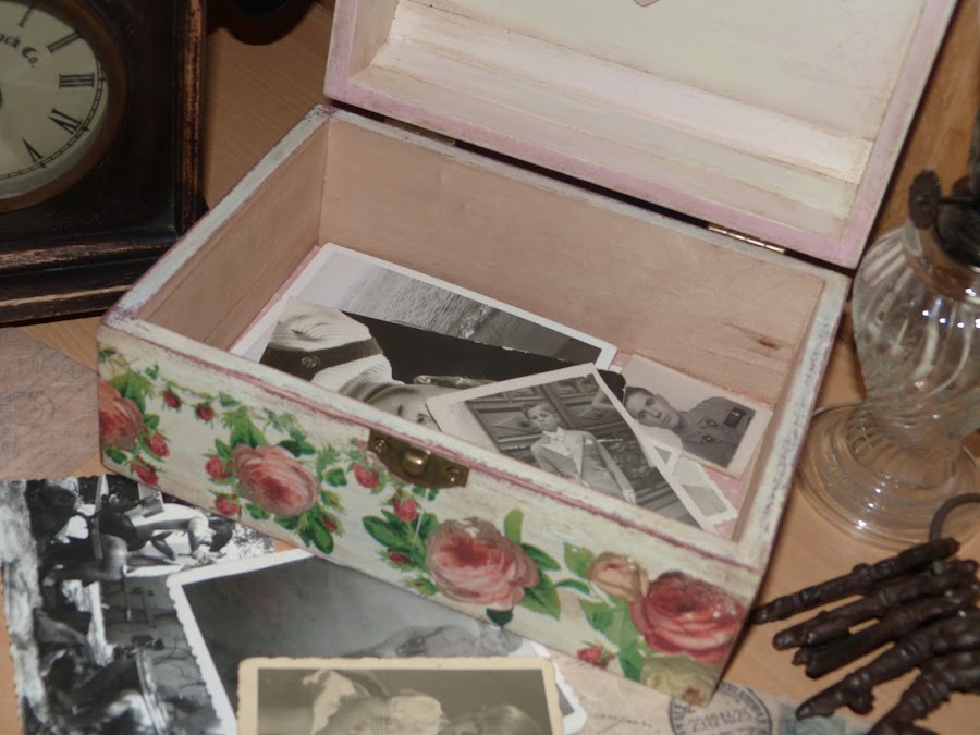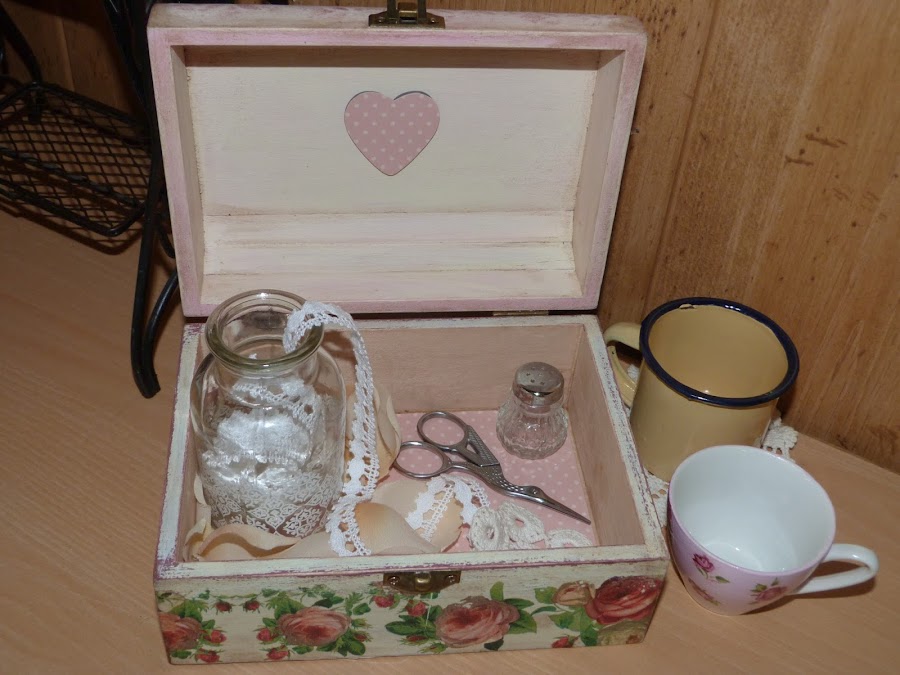 La parte que utilicé fue la cenefa de rosas, que puse en todo el contorno de la caja. Para integrarla aún mejor, con una lija fina fui repasando todos los bordes. Yo reconozco que a veces me paso, porque para resaltar el aspecto envejecido, en algunas zonas insisto mucho con la lija para desgarrar el papel... todo es cuestión de gustos.