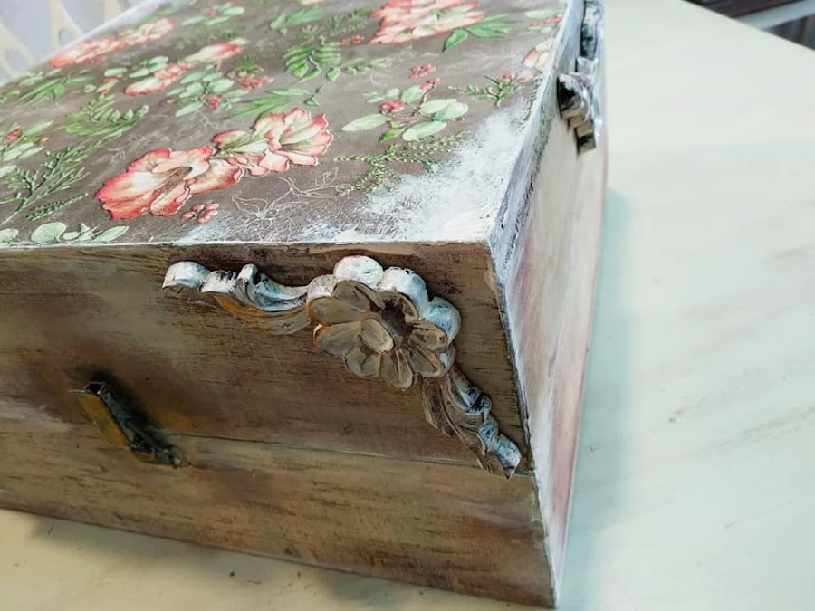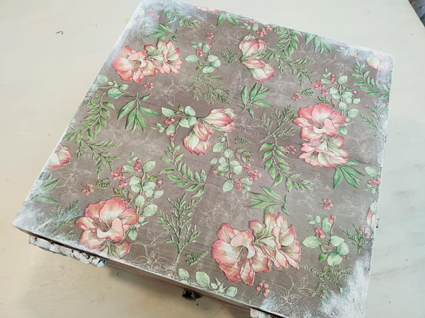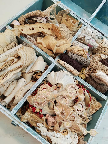 Y con esta servilleta tan bonita y unos remates rescatados de una cómoda, contiene ahora un montón de puntillas, cintas y telas que utilizamos en los talleres y con los que hacemos botes divinos, decoramos portadas de álbumes... Y todo lo que se nos ocurre.