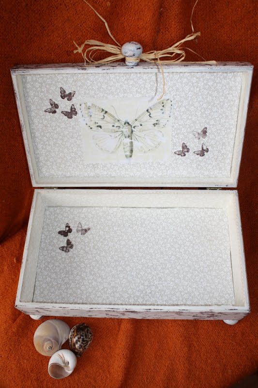 Bueno se me olvidaba....la caja esta imprimada con gesso, lijada.....pintada con un acrílico color chocolate.........pasada de velita, en diferentes zonas..........pintar con blanco roto (dos manos)........decapar.