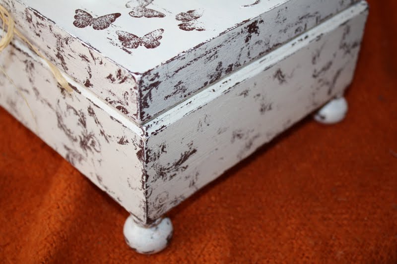 Bueno se me olvidaba....la caja esta imprimada con gesso, lijada.....pintada con un acrílico color chocolate.........pasada de velita, en diferentes zonas..........pintar con blanco roto (dos manos)........decapar.
