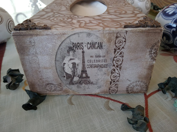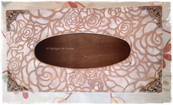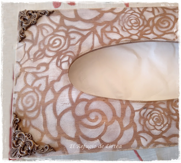 Hice unas esquineras con pasta de modelar de secado al aire y la ayuda de unos moldes flexibles, (utilizo la pasta Das o la Jovi).Antes de pegarlas las pinté en color marrón chocolate y luego apliqué con pincel seco pintura metalizada acrílica en color marrón.