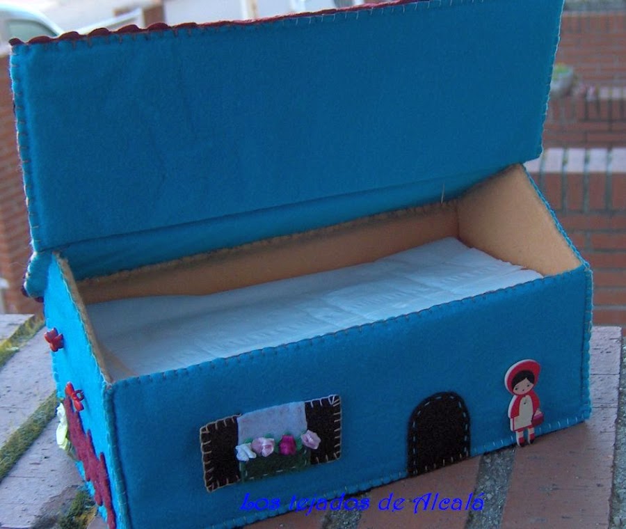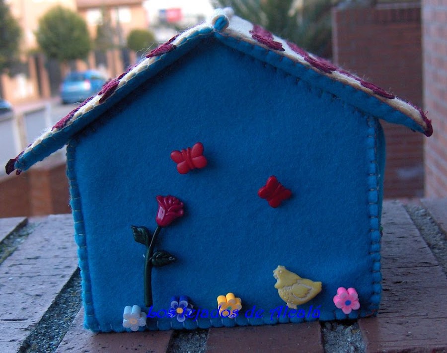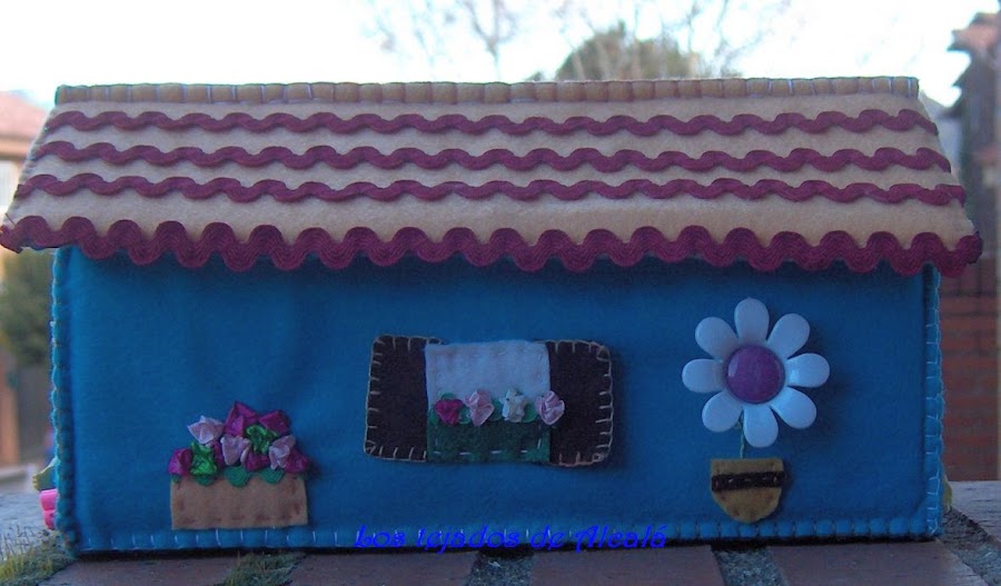 La he ido haciendo sin patrones. Con una caja de pañuelos he cogido las medidas para ir formando la casa. Unos cuantos detalles con cintas y botones regalo de Margarita y Xudite y cartonpluma entre las dos capas de fieltro, para hacerla más resistente, y cosida toda a punto festón.