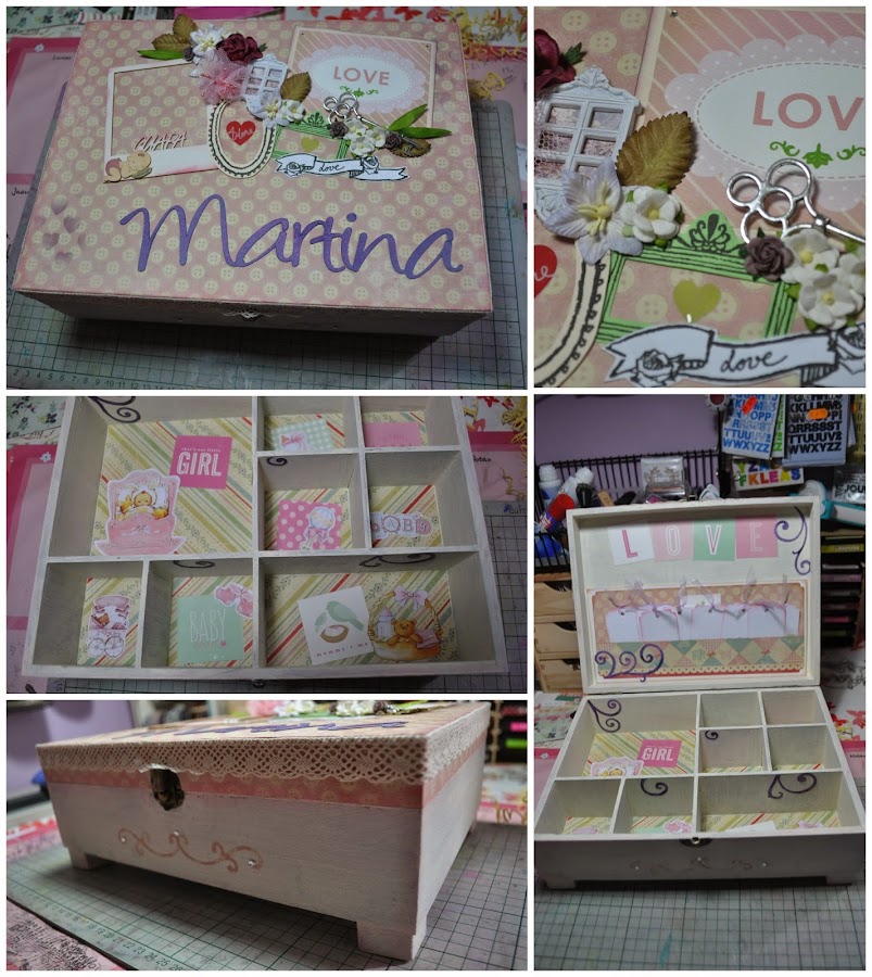 Vero me había comentado durante su embarazo que le encantaría tener una caja de recuerdos para su pequeña y un diario donde poder anotar todas las anécdotas del primer año, mes a mes...así que me puse manos a la obra para crear esas dos piezas. Hasta ésta semana no pudimos verles a ellos, recién estrenados como papis y a su preciosa niña y entregarles esos regalos para que dejen constancia de una época que pronto pasa y que tanto gusta recordar en algunos momentos. Espero que les haya gustado mucho y que disfruten anotando los pequeños logros y anécdotas de la pequeña y guardando sus primeros tesoros dentro de esa caja.