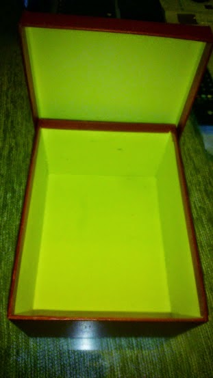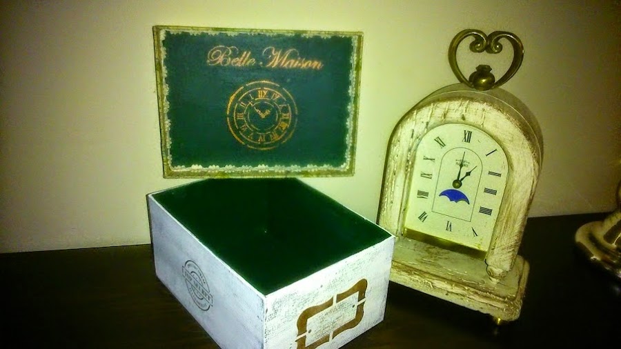 Dentro de la caja la pinte en verde soldado, y con platillas de lucia ,le pinte un reloj y una frase (Hermosa casa ) en pintura dorada.Para rematar le pegué una puntillita blanco roto ,alrededor de la tapa por dentro