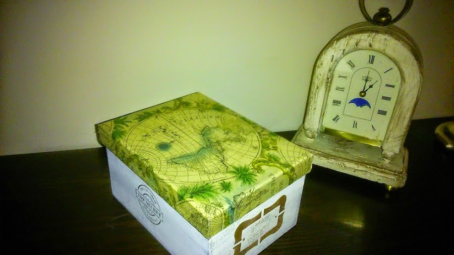 Estaba muy ilusionada por el valor sentimental que tenia la caja, cuidándola como un niño pequeño, la fui transformando poco a poco.La tapa me encantó como quedaba con la servilleta de mapa