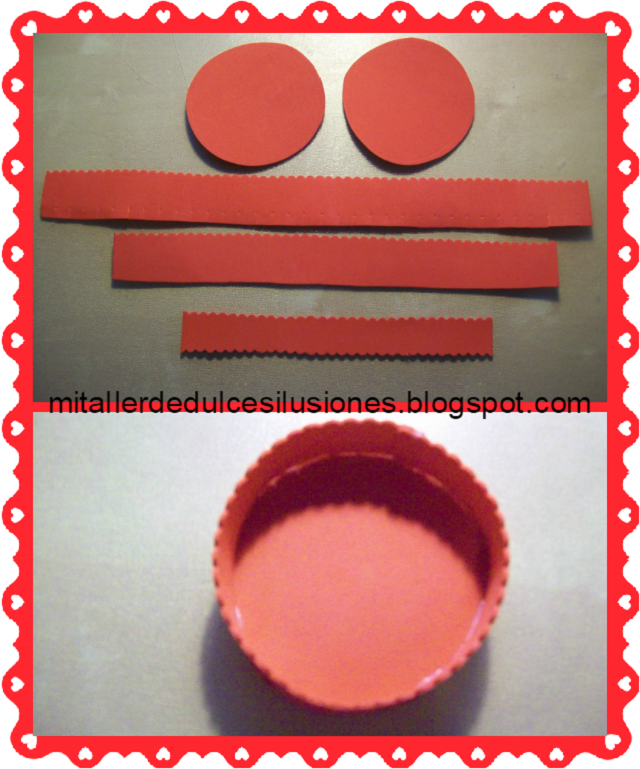 3.Comenzamos a cortar la goma eva o foami,no hay medidas,el grosor que queráis,tenéis que cortar una tira de la medida de la parte de abajo del trozo de plástico que tenéis,otro para hacer la tapa de la medida de la parte de arriba(procurar cortar unos milímetros más para que podáis meter bien la tapa,dos círculos uno para la base y otro para la tapa(también unos milímetros más grandes)y comenzar a pegar vuestras piezas.