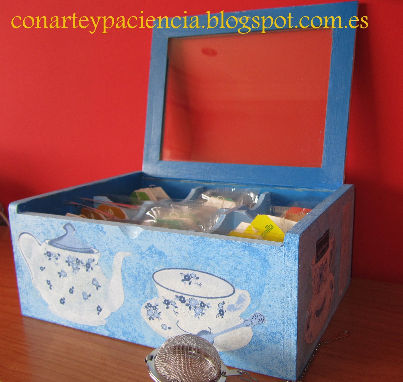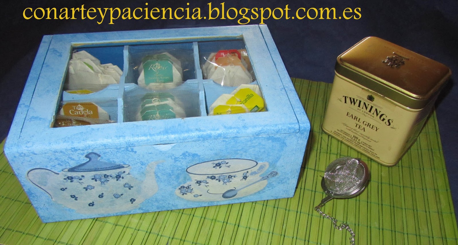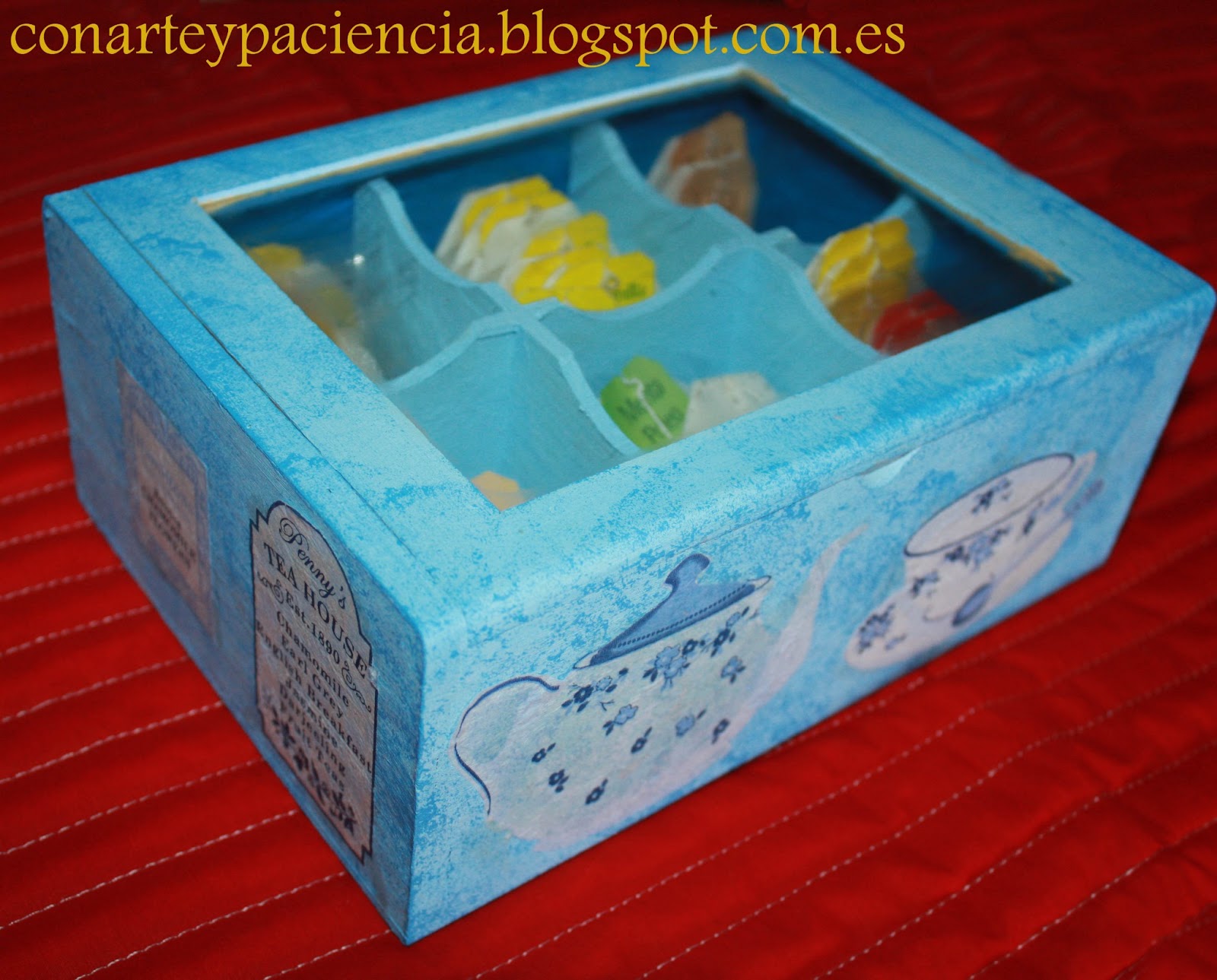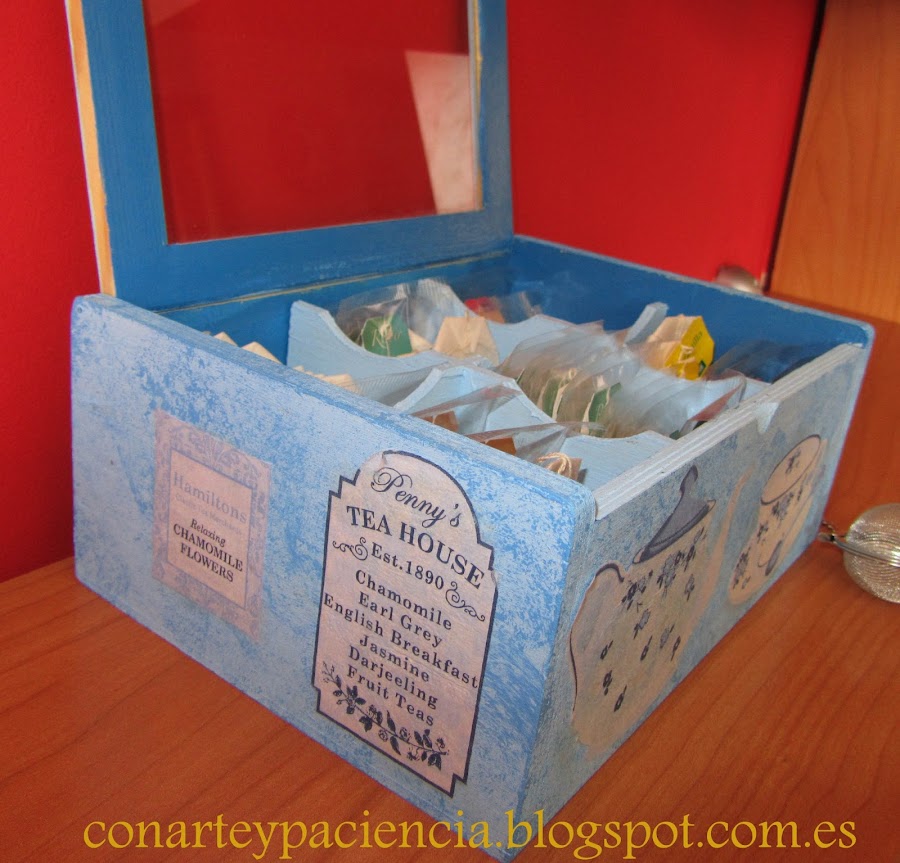 Con esta caja ya no tenemos excusa para seguir teniendo nuestras bolsitas de té en diferentes cajas y perdidas en el fondo de nuestros armarios. Los motivos que elegí para esta caja, me parecieron ideales pero podéis elegir otros.