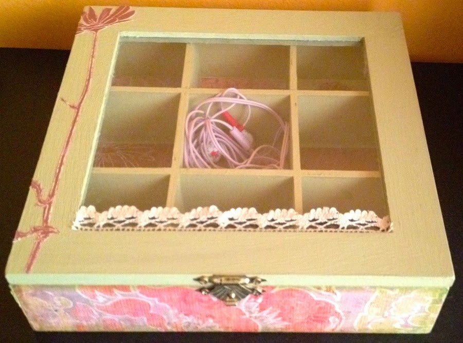 Os enseño una caja de té decorada con pintura y papeles scrap y con los cantos distresados, para que parezca desgastada.