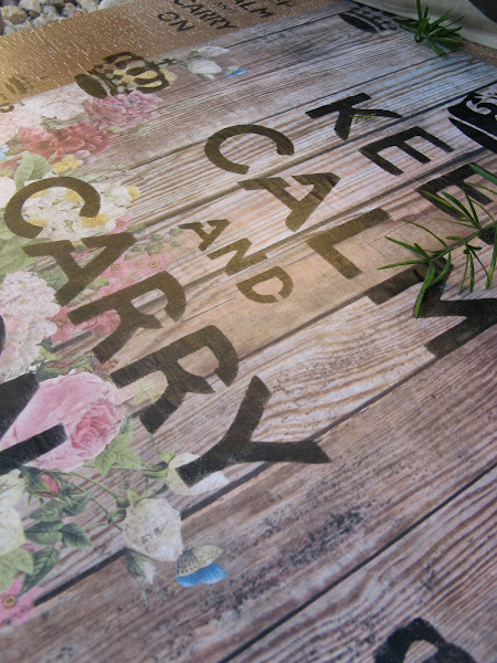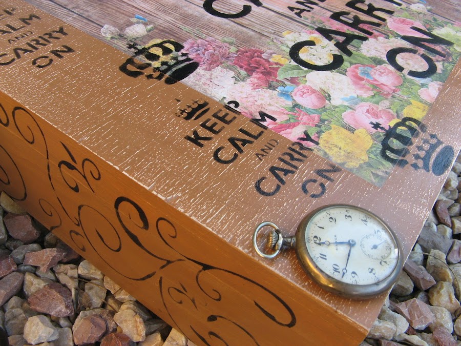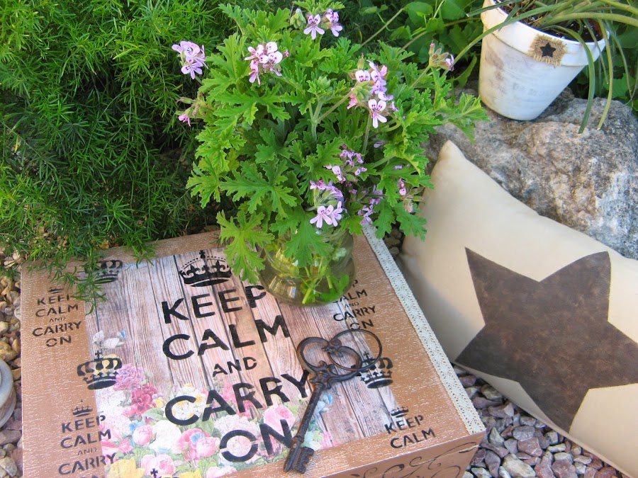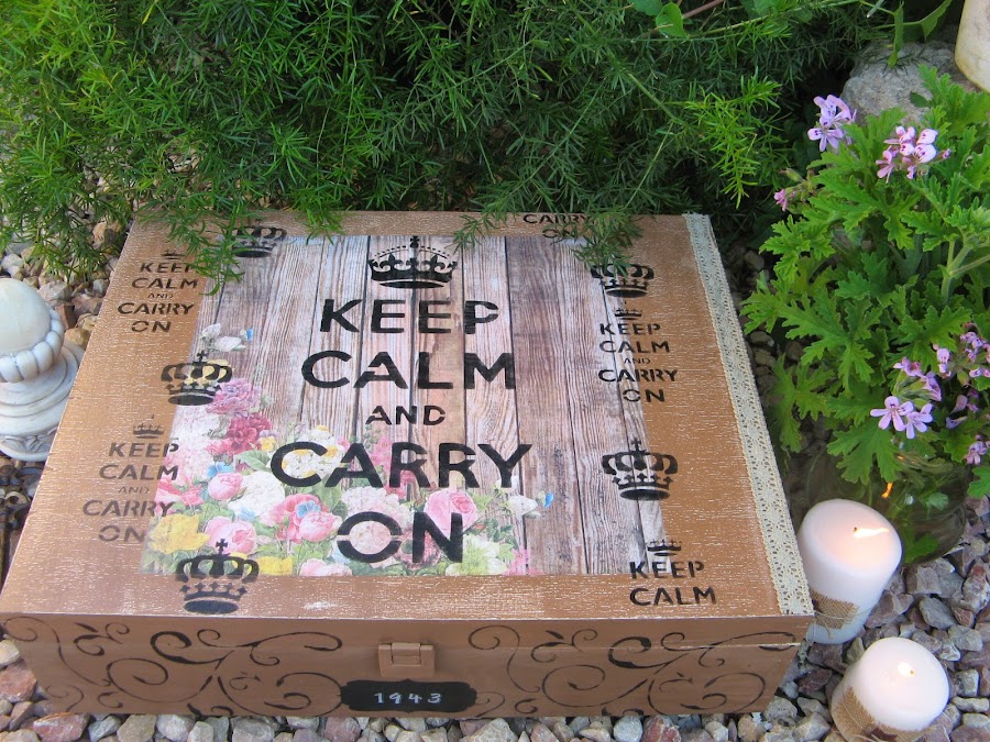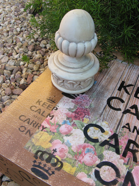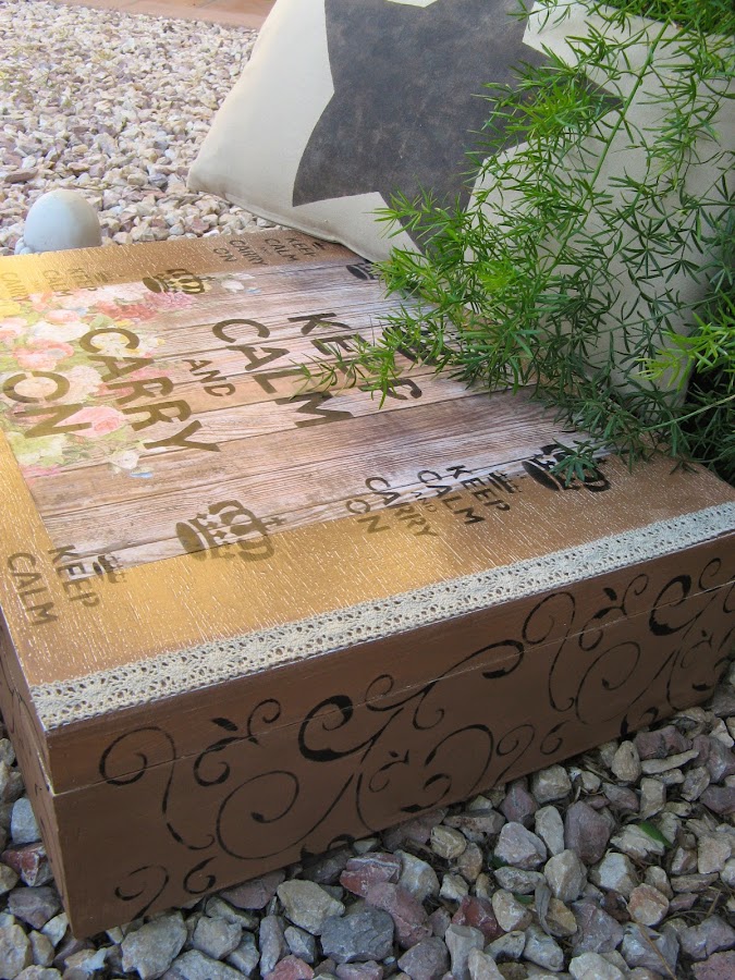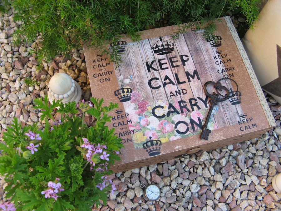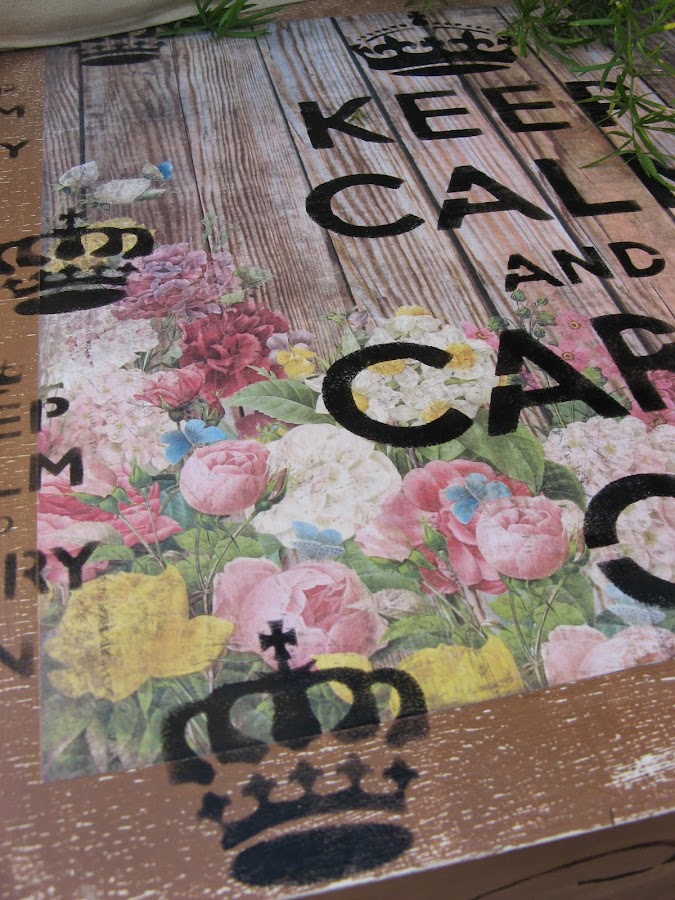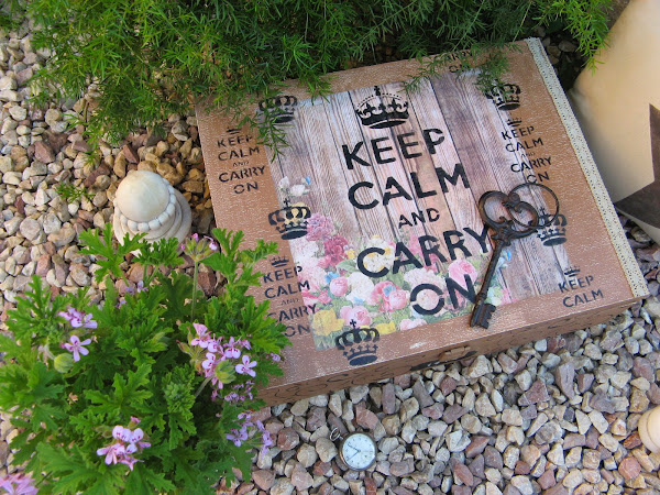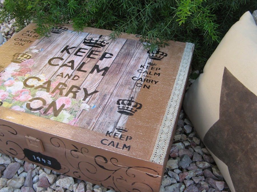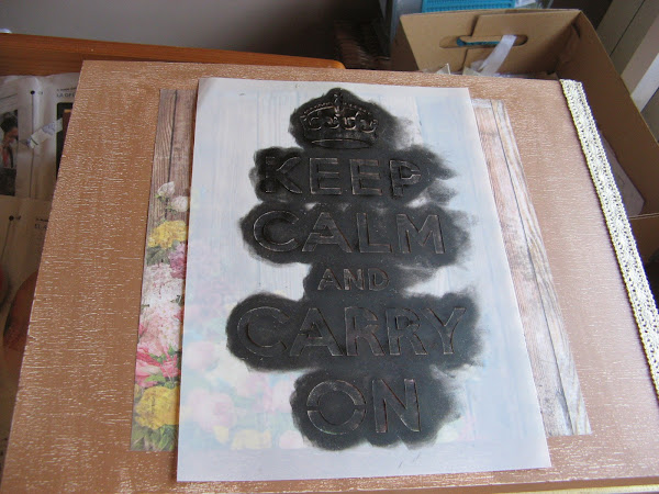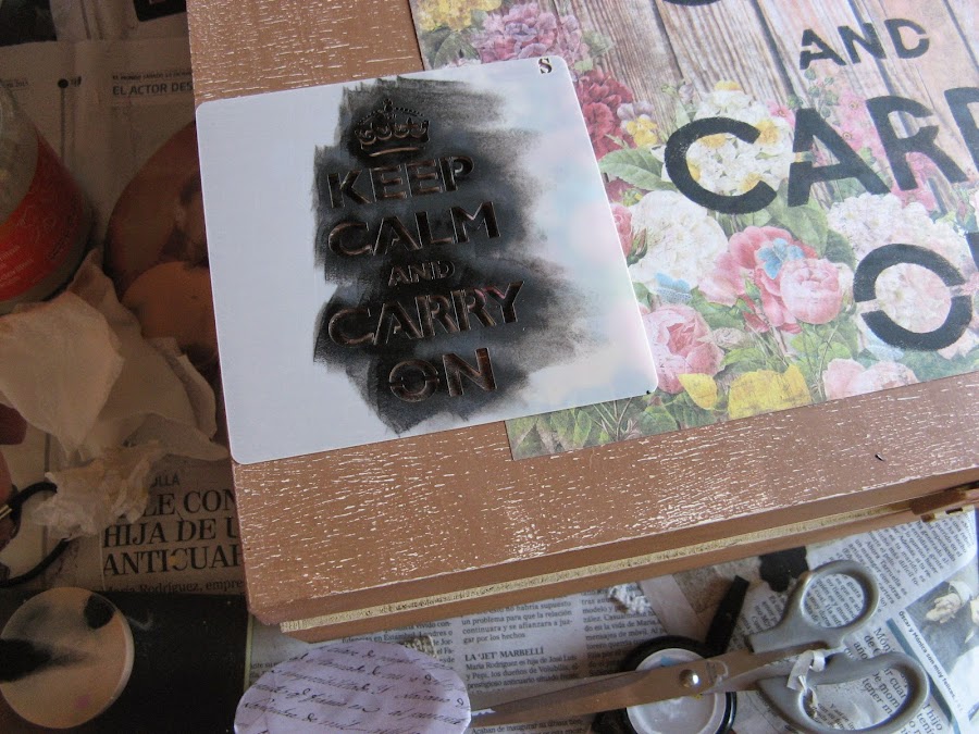 El estarcido con la archiconocida plantilla de Keep calm and carry one "mantén la calma y sigue adelante" Os pongo el enlace a la historia de cómo surgió esta frase en plena 2ª guerra mundial....es una frase que tambien podemos aplicar al tiempo presente....