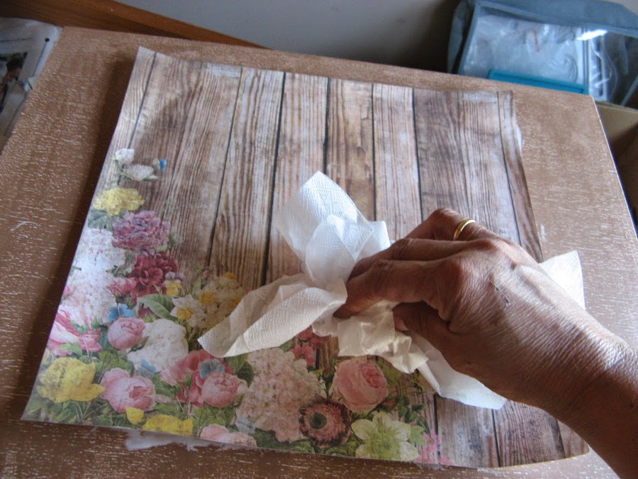 una vez puesta la cola dejé caer el papel mirando una y mil veces que estuviera en su sitio correcto. Del centro hacia los extremos se vá presionando para evitar que queden burbujas. Cuando ya lo tuve bien adherido ¡¡¡toma yaaa¡¡ vá y me doy cuenta de que no estaba centrado...menuda rabia, ya no se podía quitar sin romperlo y anda que no se notaba.....